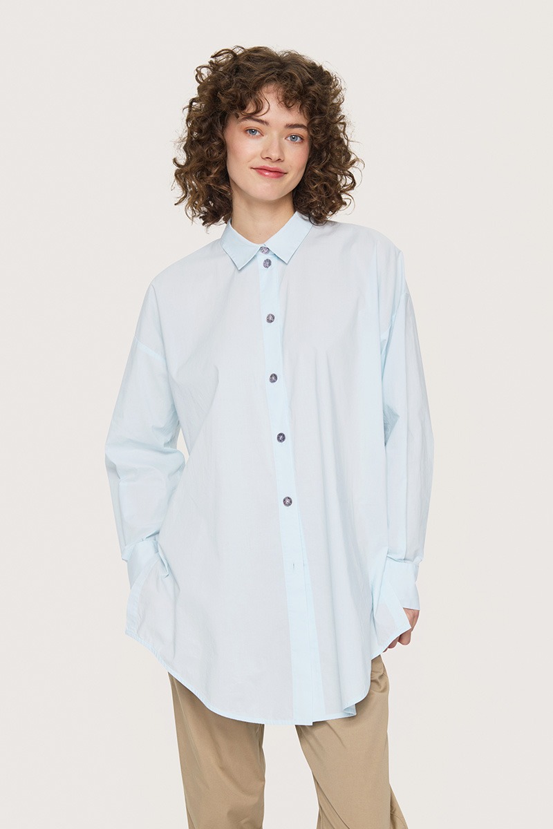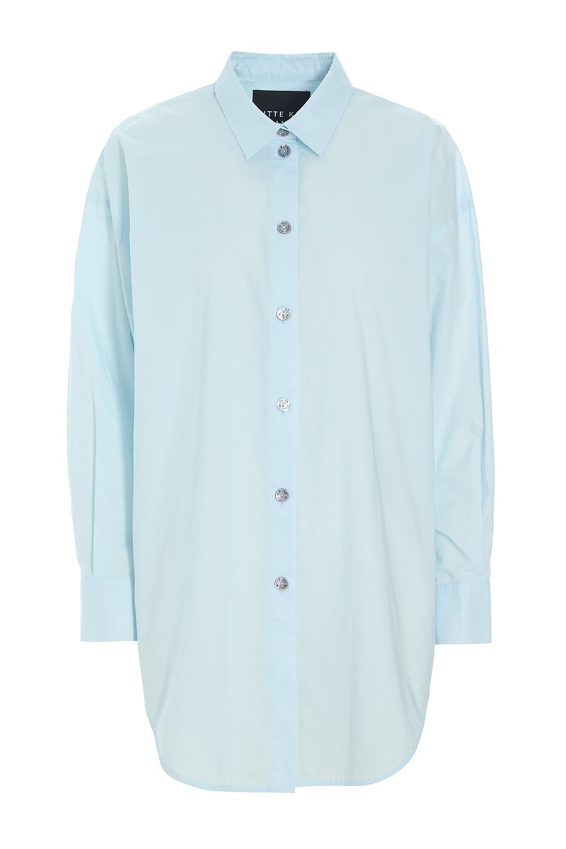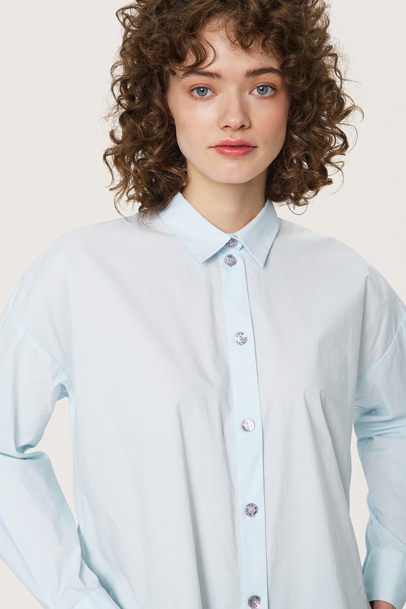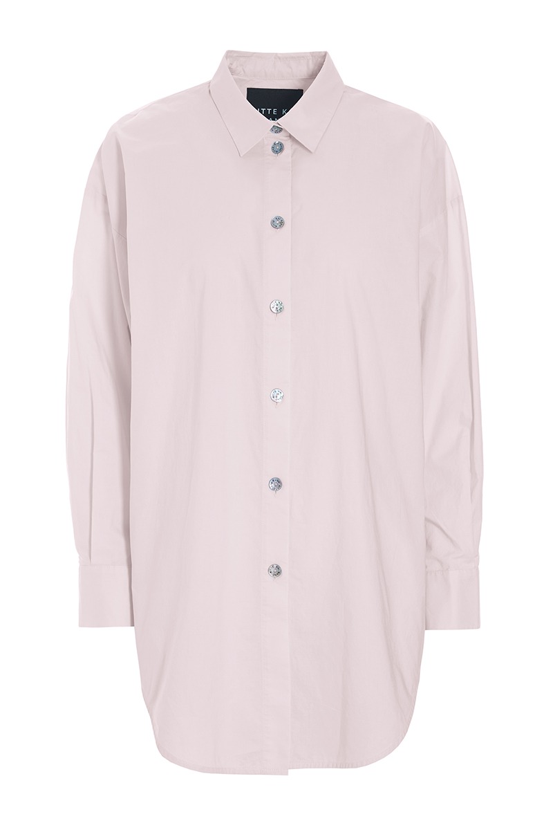 - Gennemgående lukning med perlemorsknapperli>Lange ærmer med manchetter