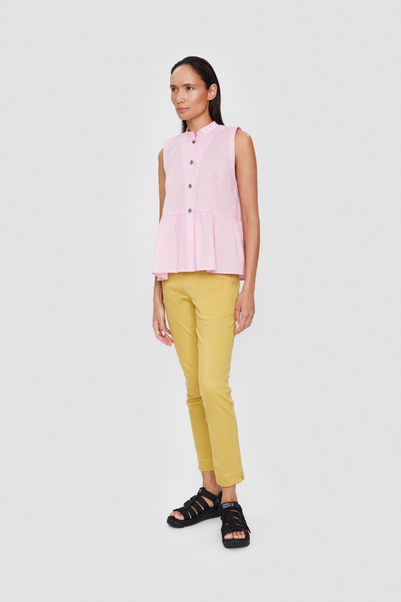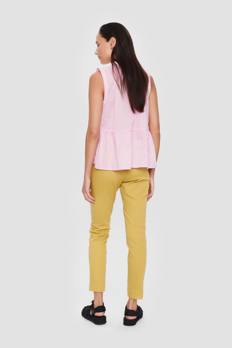 Højtaljede og tætsiddende bukser med en bred linning, der gør dem særdeles behagelige at have på samtidig med, at de har en flot pasform. Et virkelig godt basiselement i garderoben. Der er stretch i stoffet, hvilket sikrer god bevægelighed.