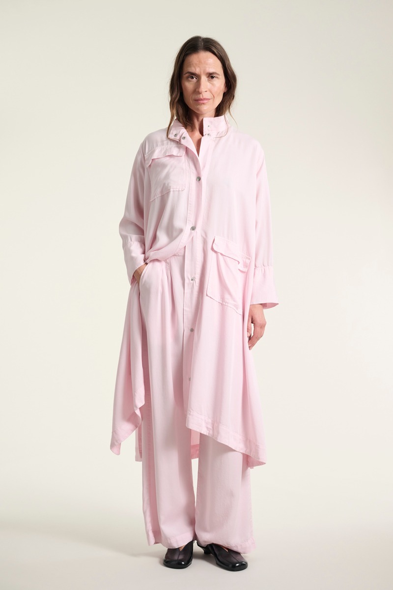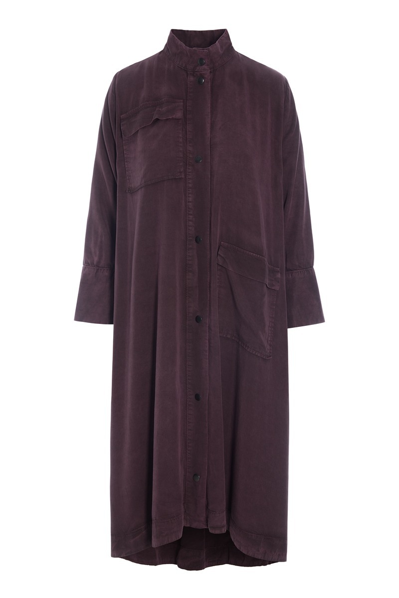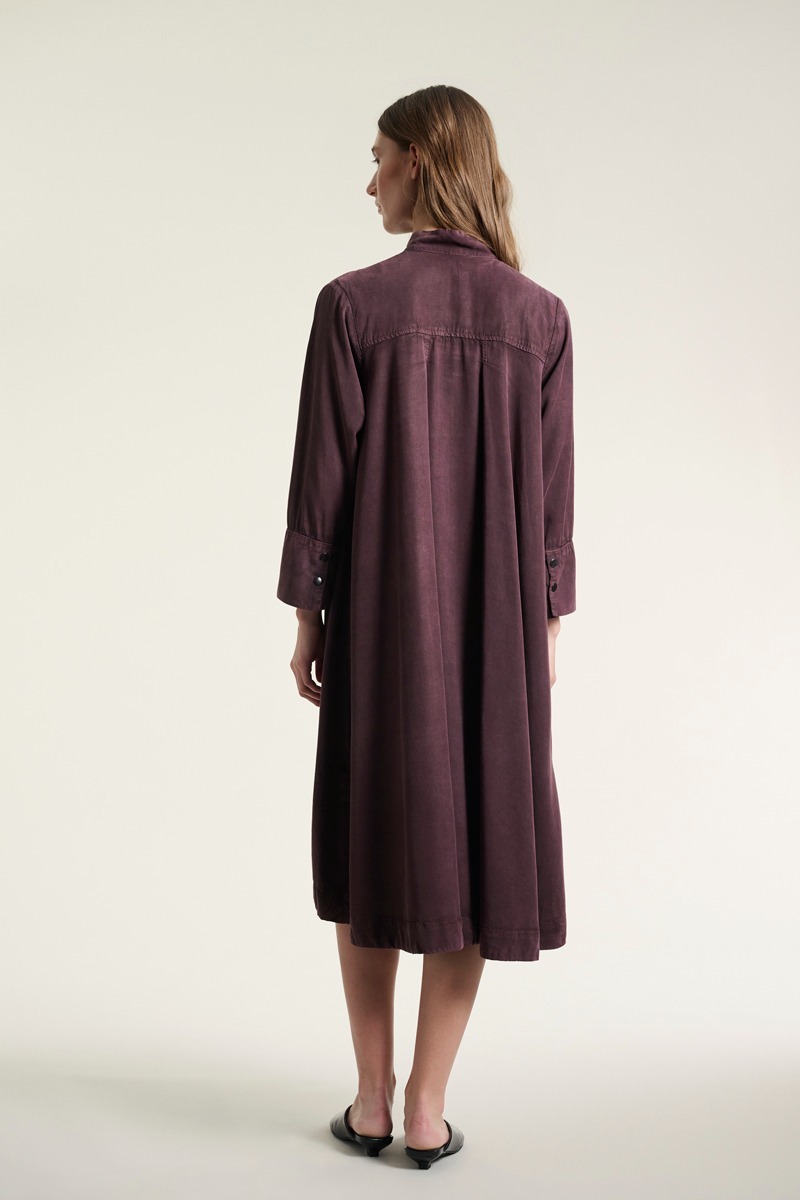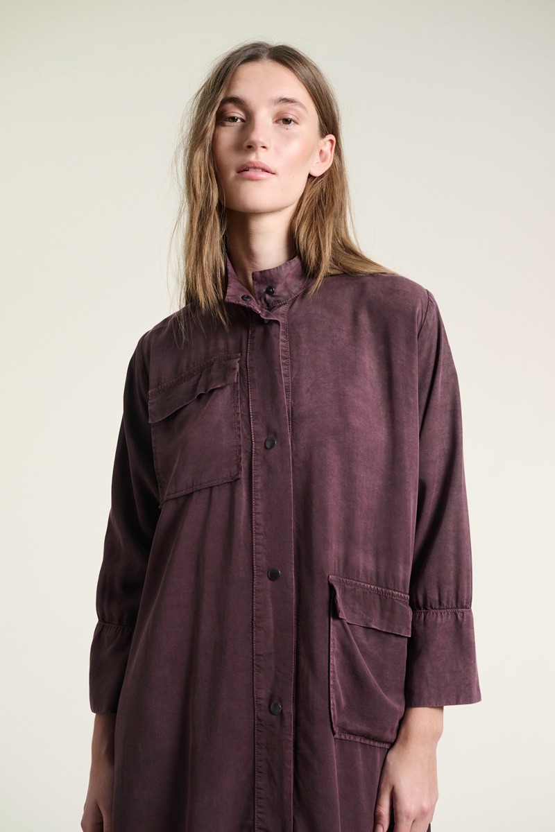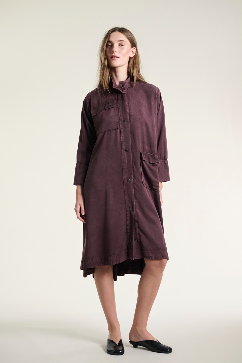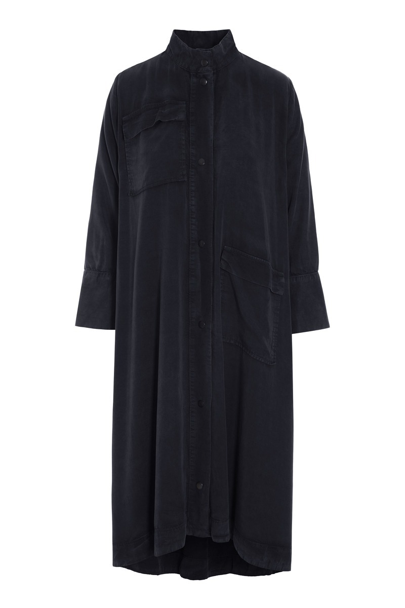 En fin kjole med en opretstående krave. Kjolen har store påsatte lommer, der giver et casual udtryk. Det er en kjole, der kan styles på et utal af måder. Brug den i al sin smukke enkelhed. Eller sæt tørklæde og bælte til. Kjolen er også flot med en vest eller blazer over.