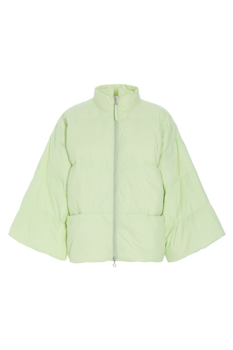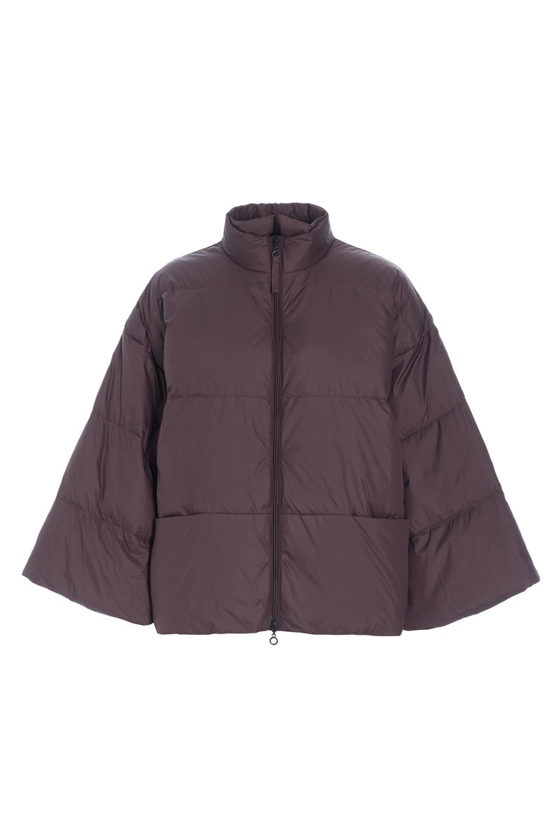 Jacke aus weichem und leichtem Daunenmaterial. Die Jacke hat einen Stehkragen mit kleinen Flögeln. Sie ist geräumig und die Ärmel sind sehr weit, was der Jacke einen luxuriösen Look verleiht. Eine schöne Alternative zu einem traditionellen Daunenmantel und eine bequeme und stilvolle Art, sich warm zu halten.