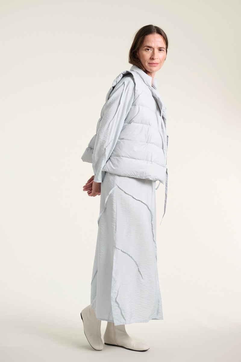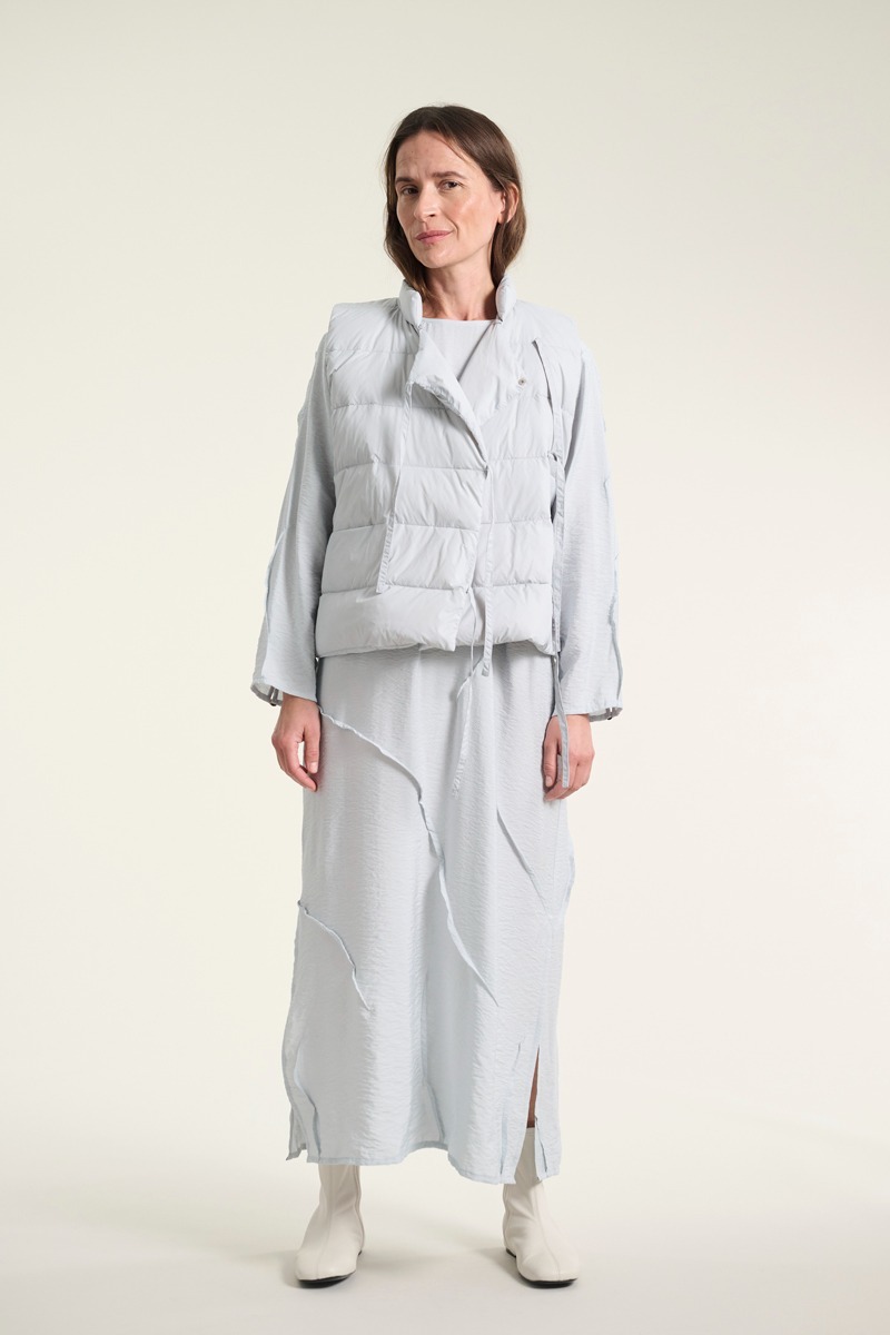 Weste aus weichem und leichtem Dungaree-Stoff. Die Weste hat einen schönen asymmetrischen Schnitt und wird mit einem Bindegörtel geschlossen, was ihr einen sehr eleganten Look verleiht. Die Weste lässt sich praktisch öber einem Hemd, Kleid oder einer Bluse tragen, wenn es köhl ist. Es ist, als wörde man eine Wolke tragen, nur etwas wärmer. Eine stilvolle Art, sich warm zu halten.