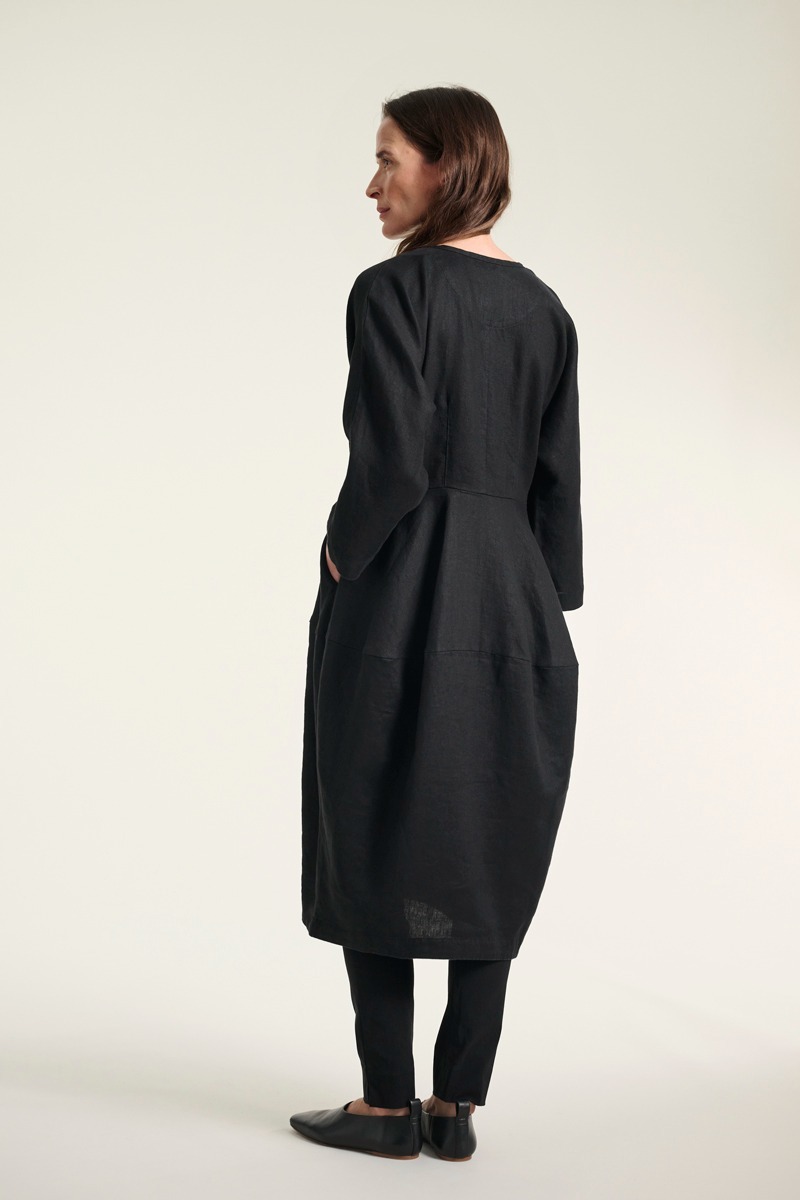 Elegantes Leinenkleid mit Reißverschluss vorne, Taillierung und leicht tulpenförmigem Rock, die zusammen eine wunderschöne Silhouette bilden. Tragen Sie das Kleid allein in seiner ganzen Schlichtheit oder kombinieren Sie es mit der kurzen Lazy-Leinenjacke för einen stilvollen und klassischen Look.