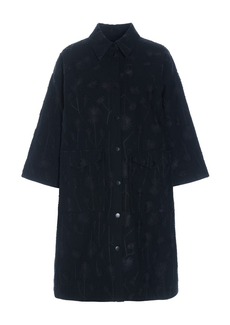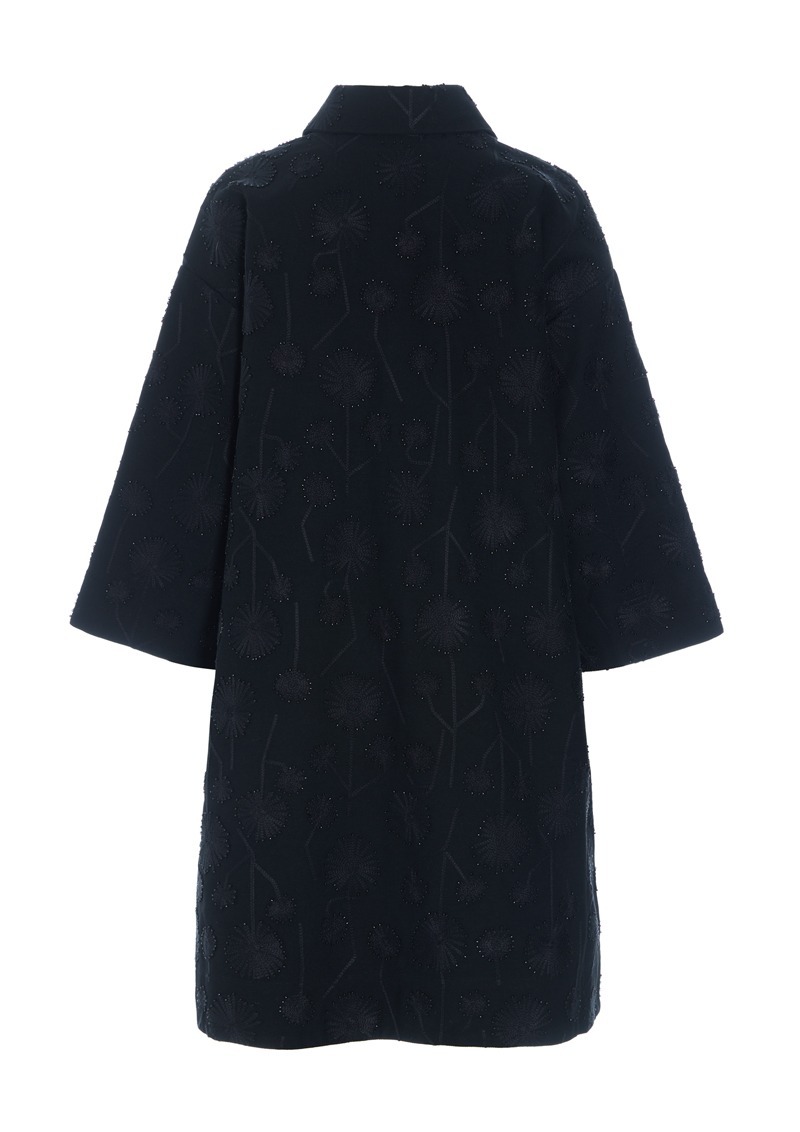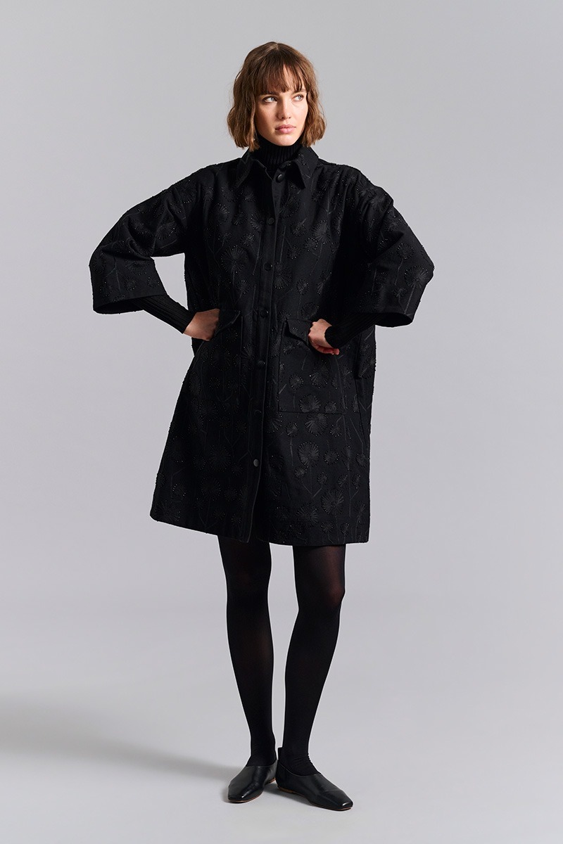 The cut of this coat dress is simple, allowing the delicate beaded flowers to get all the attention. The pearl flowers are very artistically made and make the coat dress something very special. A sophisticated and timeless addition to the wardrobe.