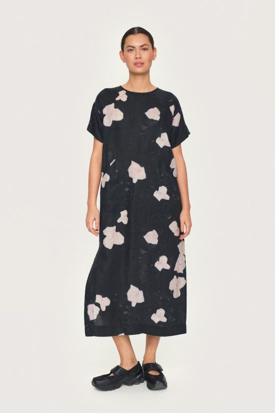 There are simple silhouettes in soft colors and sculptural silhouettes in bold hues. There are printed versions of linen dresses and linen sets featuring both floral and harlequin patterns,
