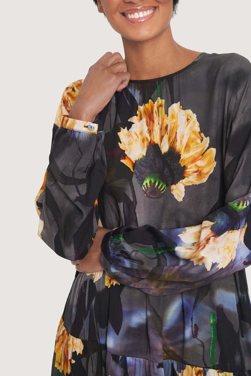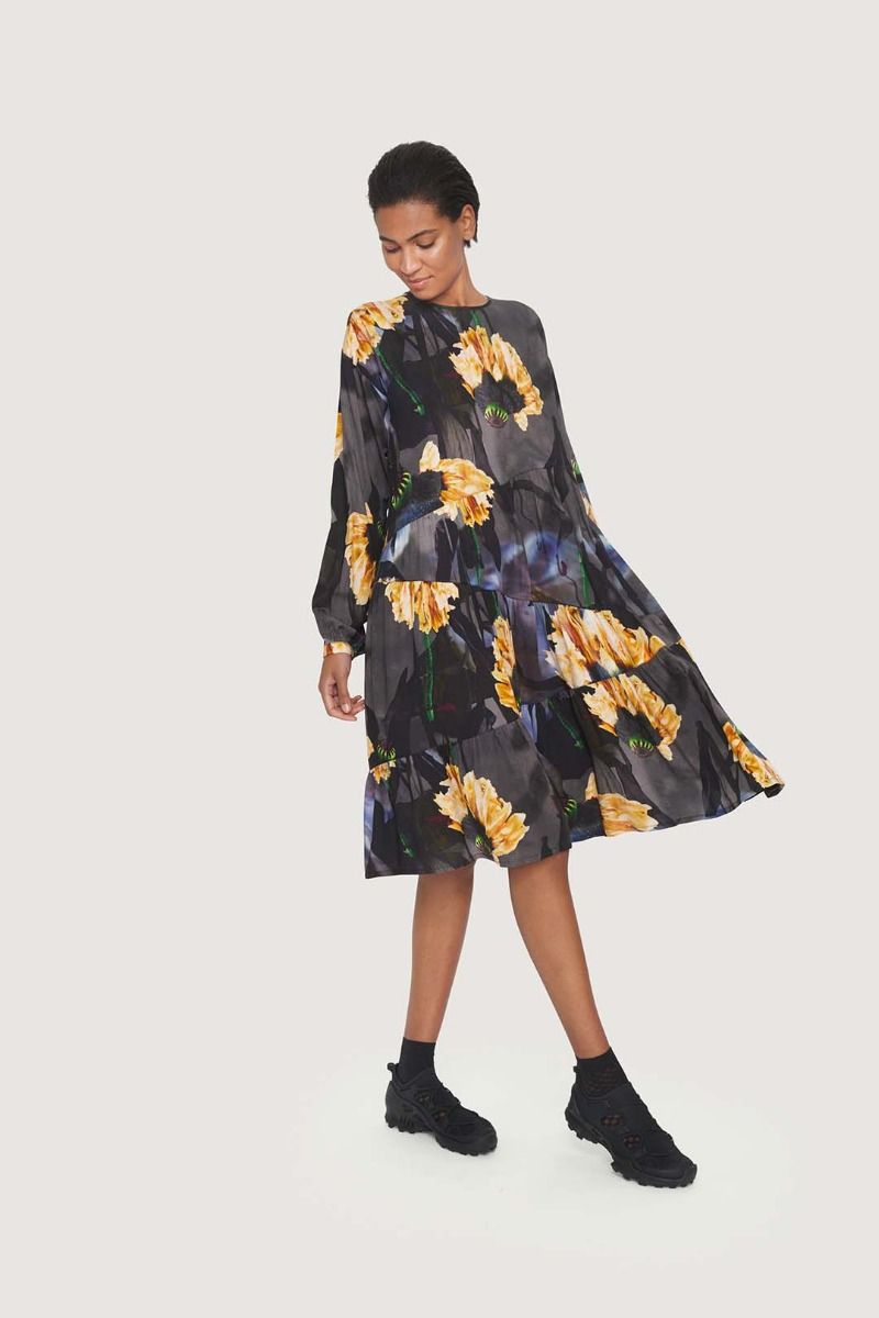 This dress is made from FSC-certified viscose. It has a simple cut and features a floral pattern in the loveliest hues. Asymmetrical cuts at the bottom break up the large print in an eye-catching way, and it's truly comfortable to wear. The model in the photo is 180 cm tall and wearing a size S Full length of approx. 109 cm in a size S.