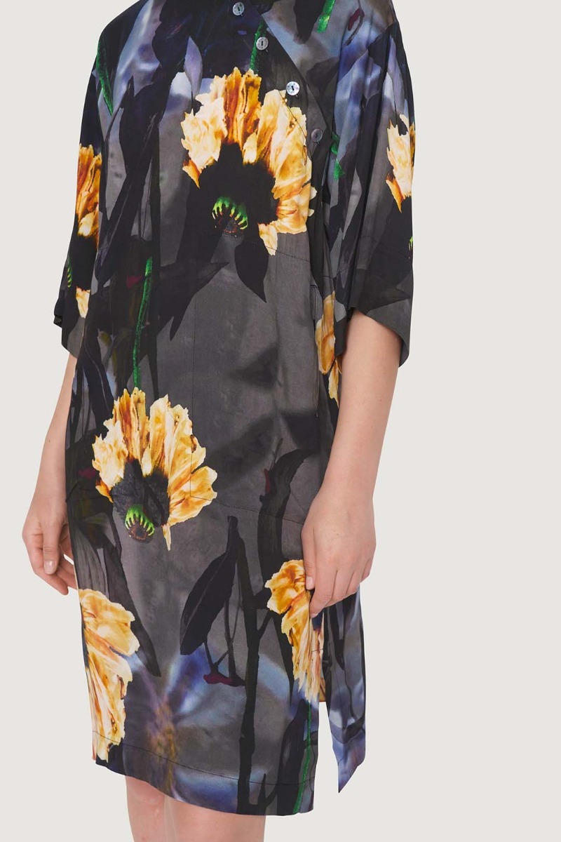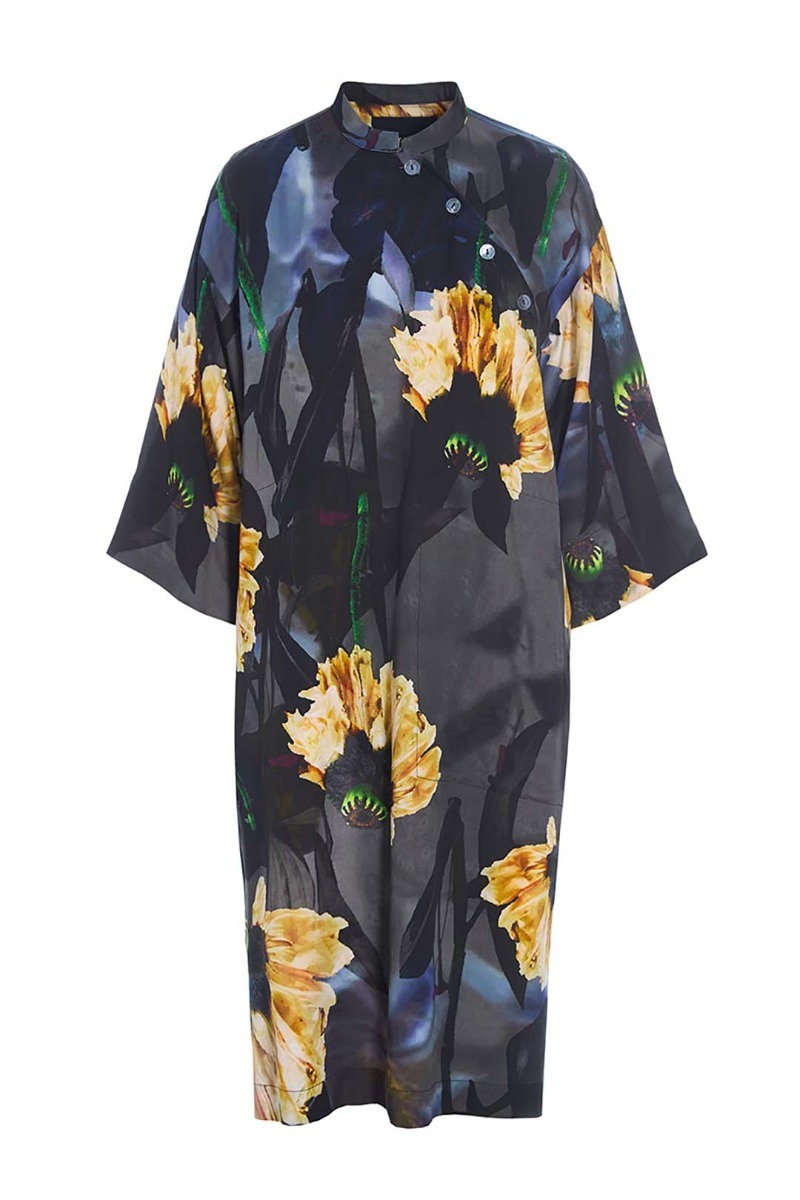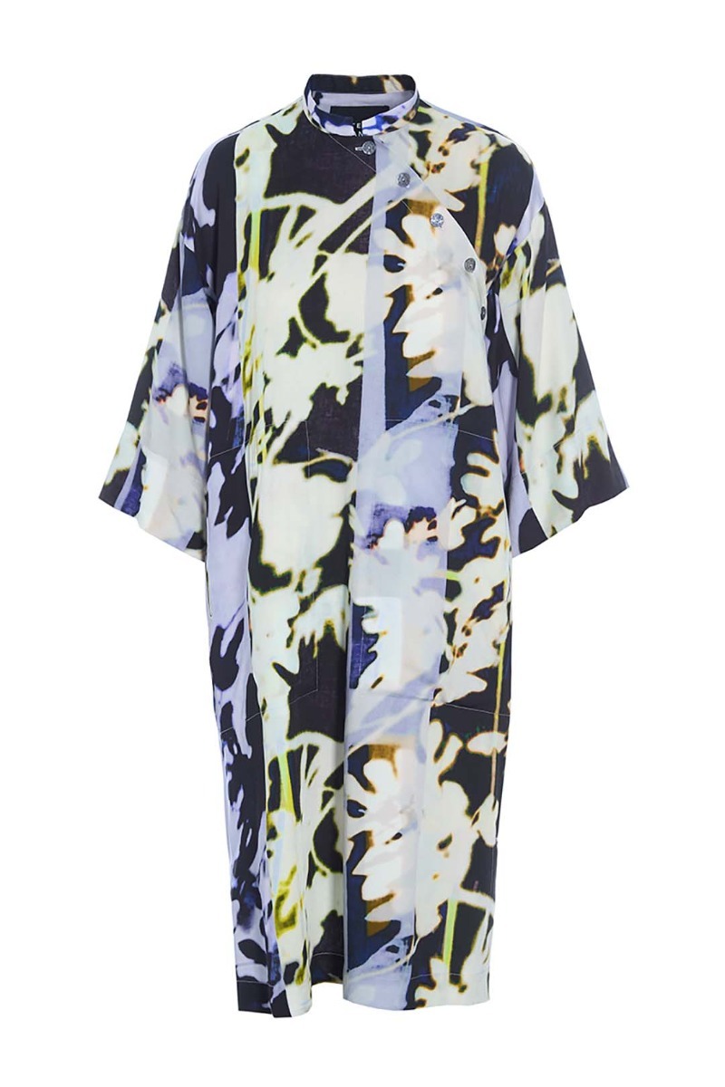 This dress is made from FSC-certified viscose. It has a simple, Asian-inspired cut and a beautiful, large-scale floral pattern in the loveliest hues. It's truly comfortable, and equally suited to ordinary days and festive occasions—just add the right pair of shoes. The model in the photo is 180 cm tall and wearing a size 1 Full length of approx. 108 cm in a size 1. Fit: Oversized