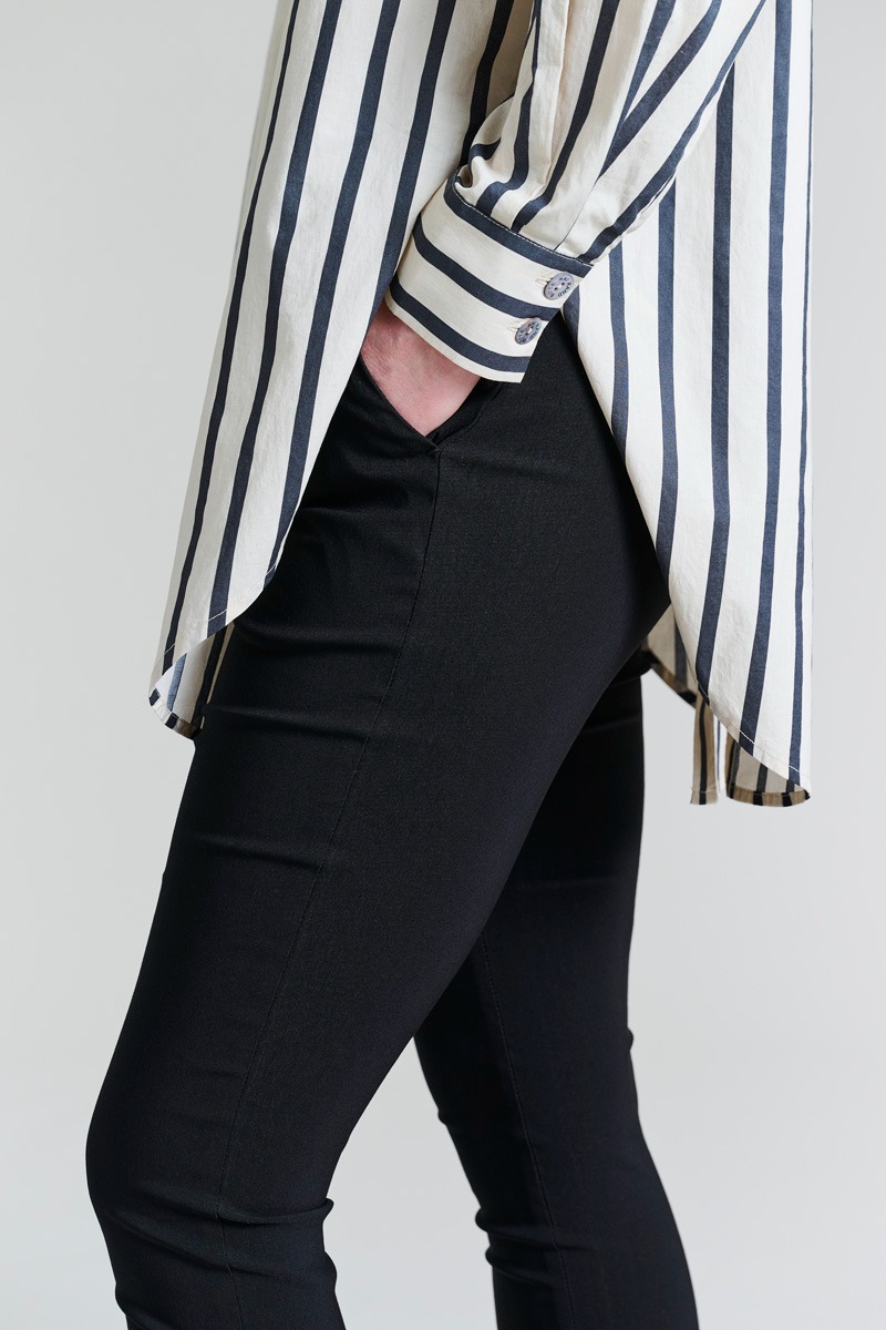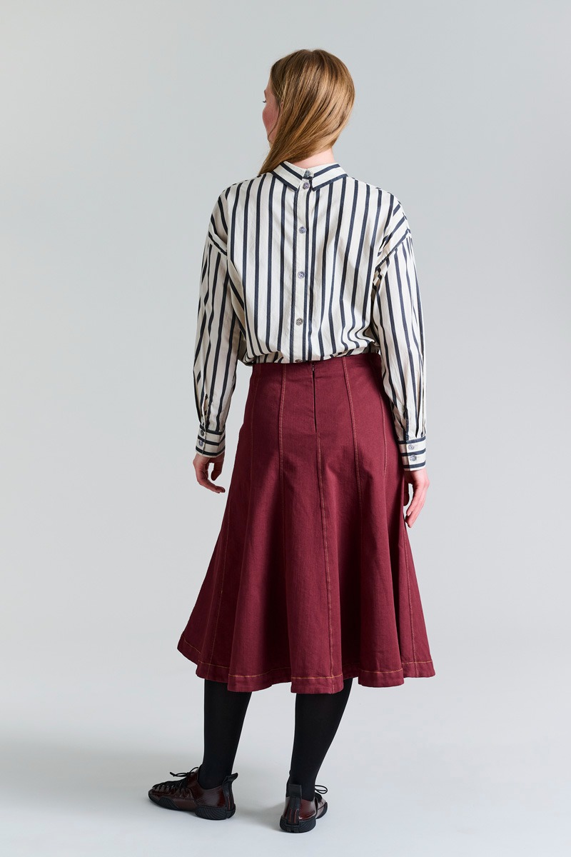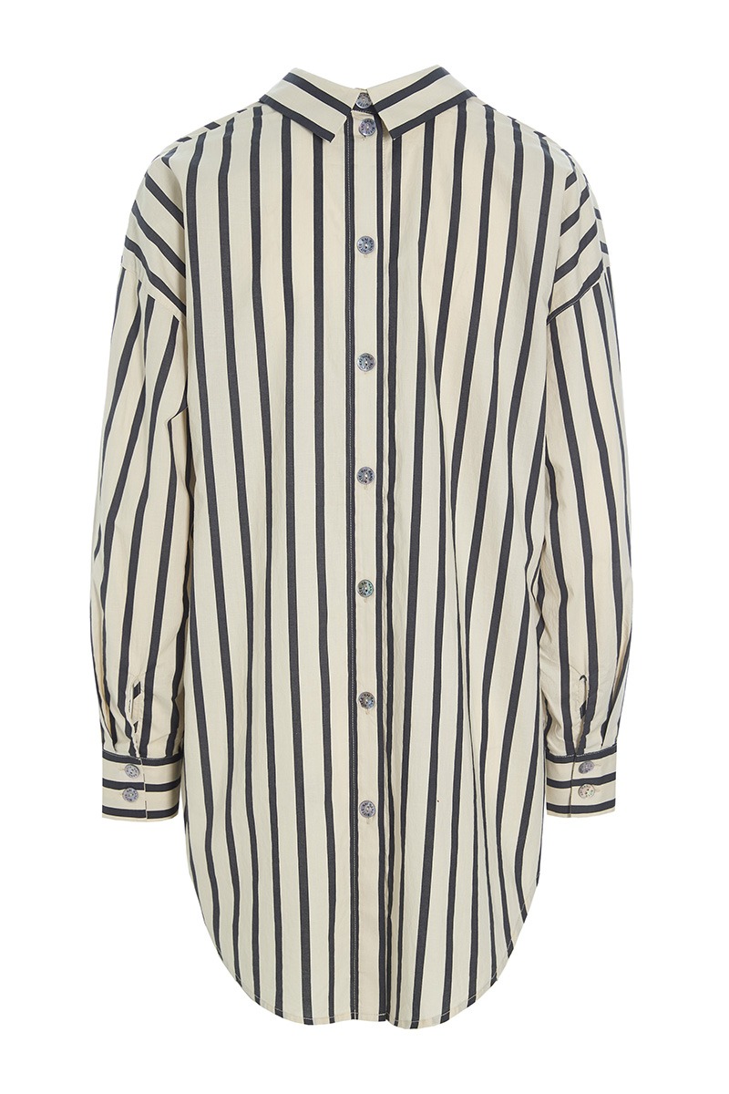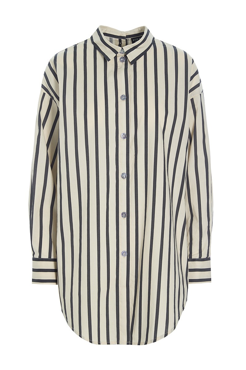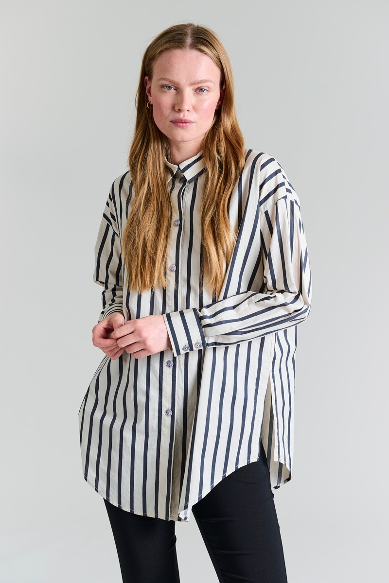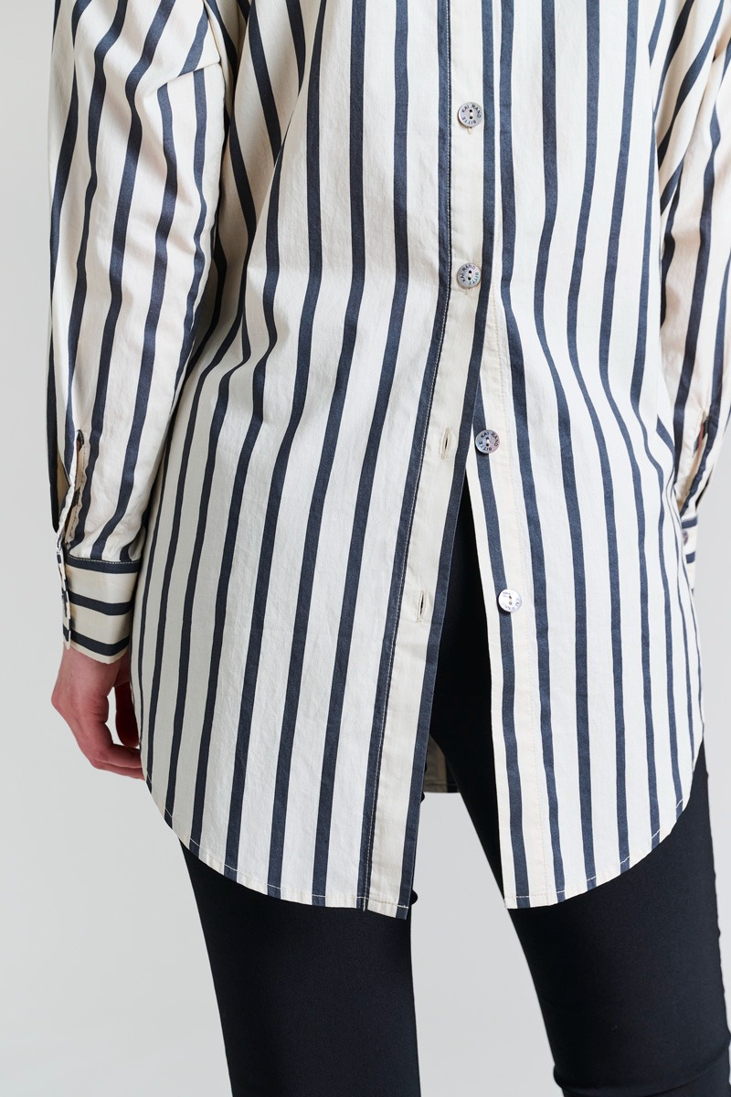 A striped shirt in a lovely, organic cotton fabric. At first glance, the design is quite classic, but it features the quirky detail of a collar and button fastening on the back as well. This makes the shirt truly special. A lovely shirt that can be paired with virtually any bottom piece. The model in the picture is 178 cm tall and is wearing a size S. Full length in size S: approx. 84 cm.