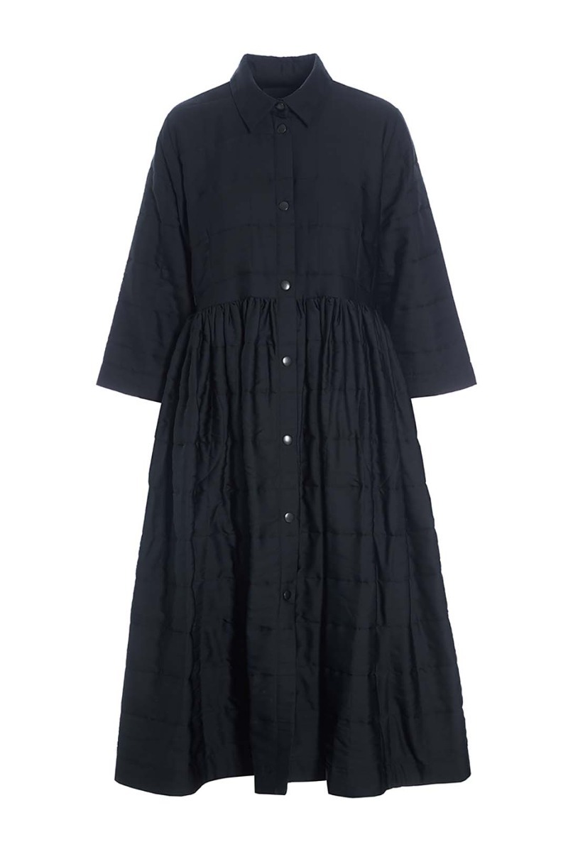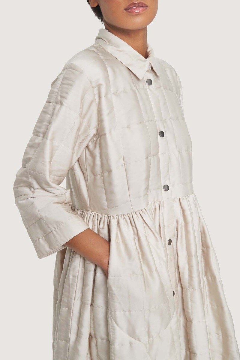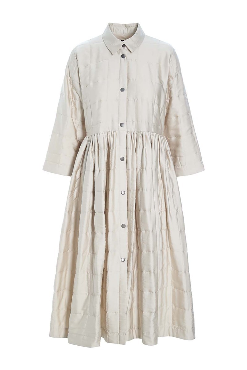 This beautiful shirt dress stands out in more ways than one. It's quilted and lightly padded, and the surface is a bit glossy, emphasising the festive look. The dress has a simple cut and plenty of width in the skirt. This shirt dress is ready to add elegance to ordinary days and festive occasions alike.