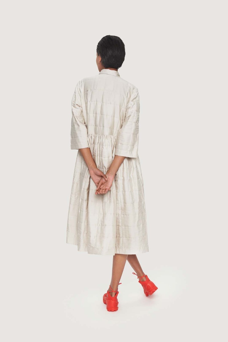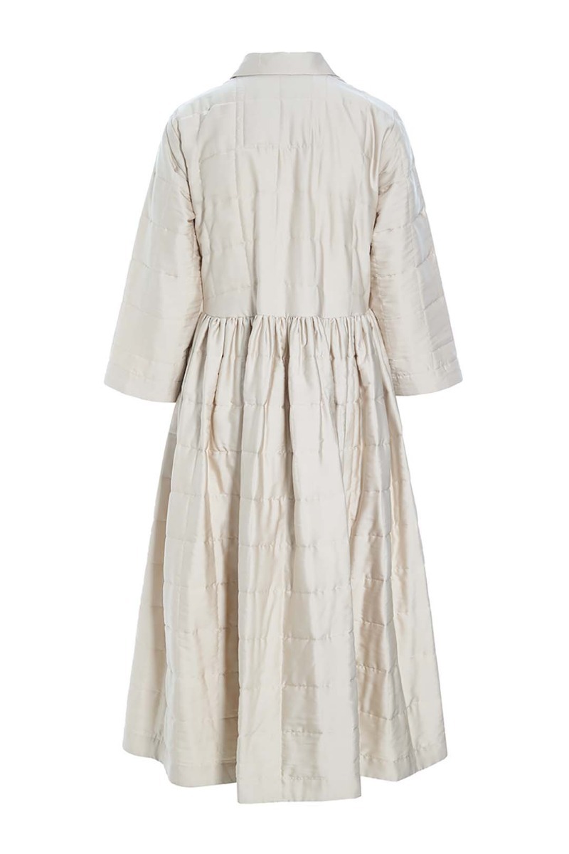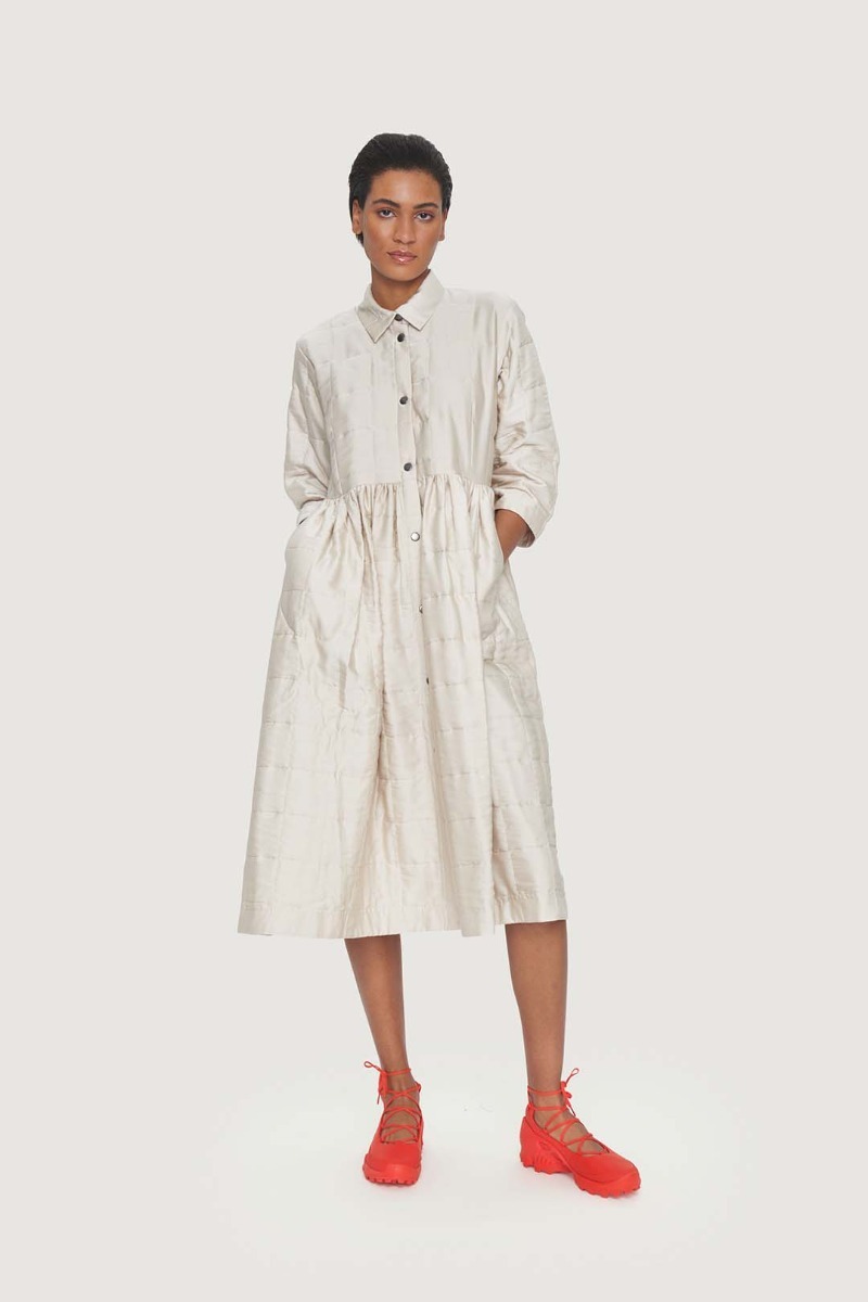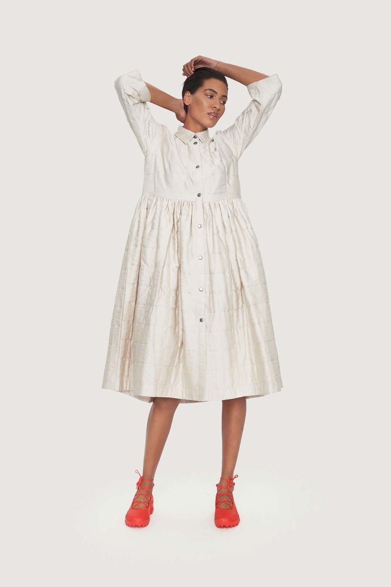 This beautiful shirt dress stands out in more ways than one. It's quilted and lightly padded, and the surface is a bit glossy, emphasising the festive look. The dress has a simple cut and plenty of width in the skirt. This shirt dress is ready to add elegance to ordinary days and festive occasions alike.