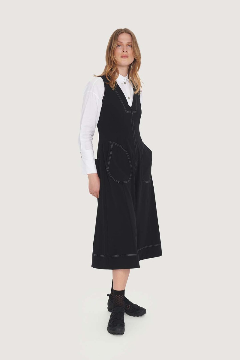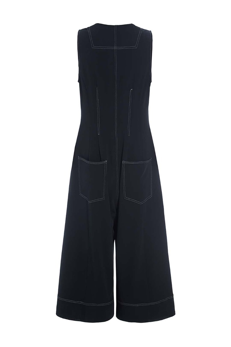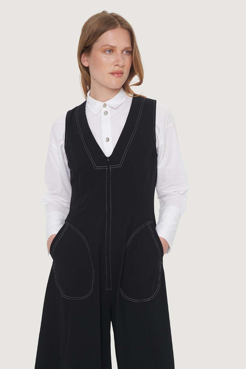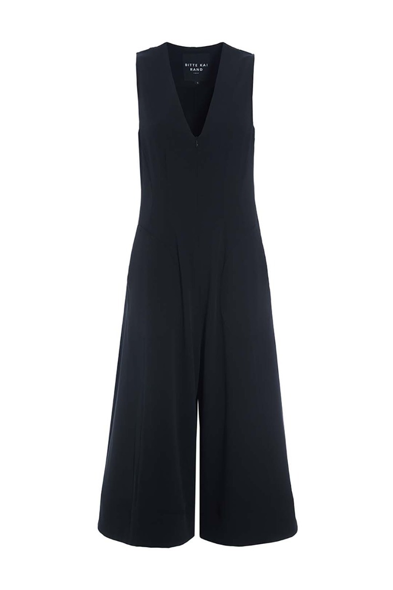 This simple jumpsuit has wide legs. It features a V-neck and is made from lovely polyester with stretch, giving it a pleasant drape. Putting together a stylish outfit is easy with this jumpsuit: just add a blouse, T-shirt, or dress shirt and you're set. For evenings, it looks great with bare arms.