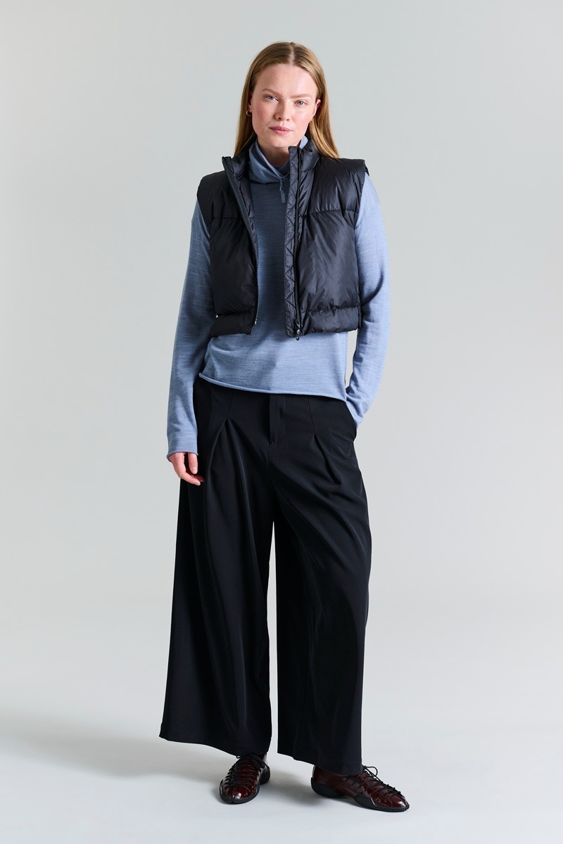 Kort väst i en mjuk och superlätt dunkvalitet. Västen har en enkel skärning, och den är både elegant och praktisk att bära över till exempel en skjorta, kofta, jacka eller blus när vädret är svalt. Det är som att bära ett moln – fast mycket varmare. Ett snyggt sätt att hålla sig varm.