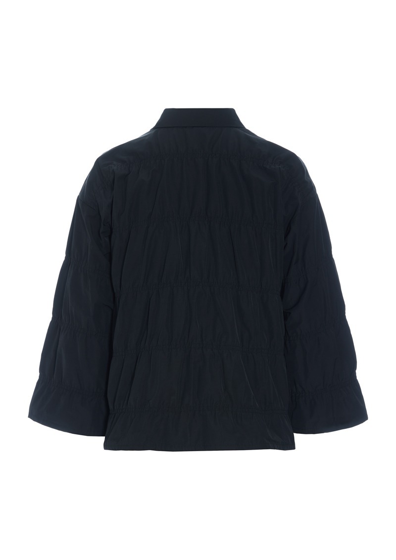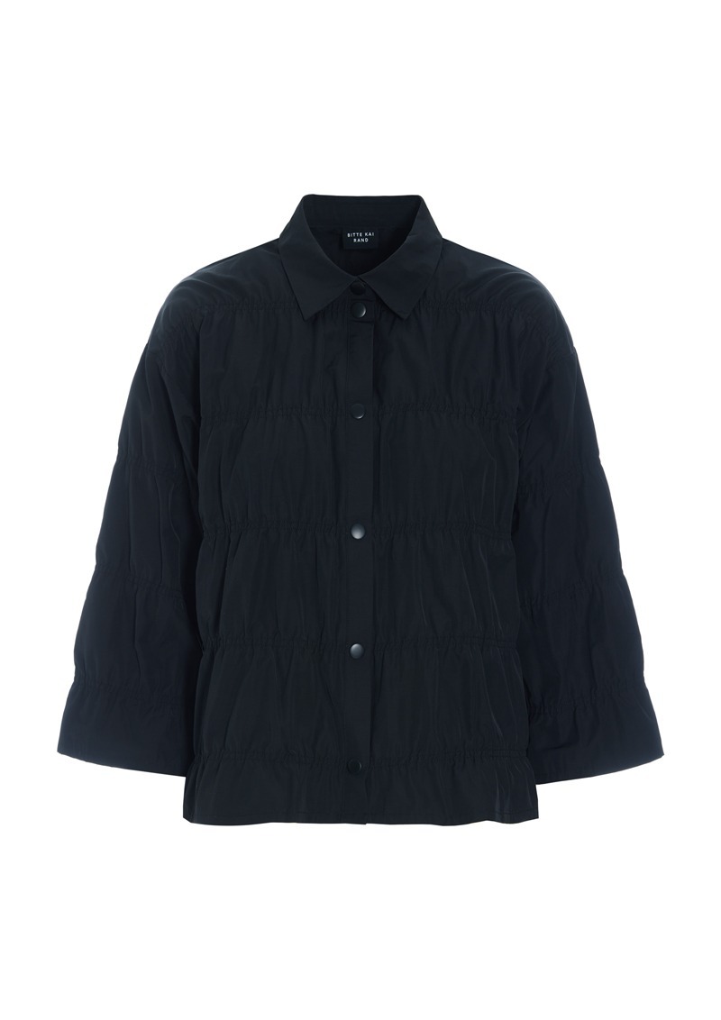 Jacka i en prasslande bomullskvalitet med tvärgående elastiska sömmar som skapar en fin rynkeffekt och ger jackan ett festligt och elegant uttryck. En jacka som kommer att uppgradera varje underdel. Använd den stängd eller öppen, och låt en kroppsnära blus kika fram vid de 3/4-långa ärmarna.