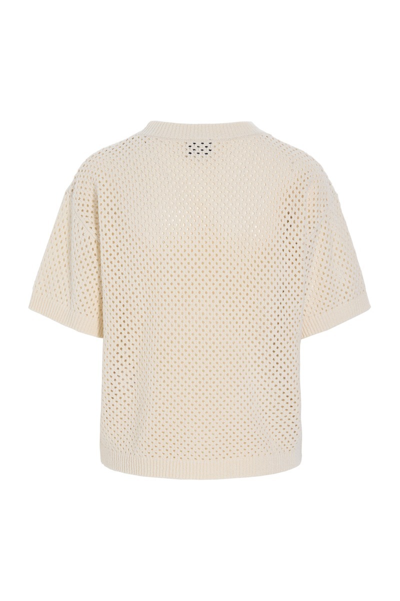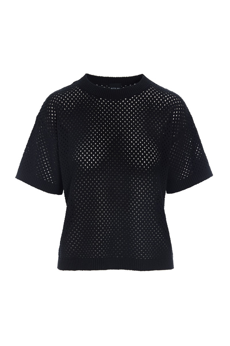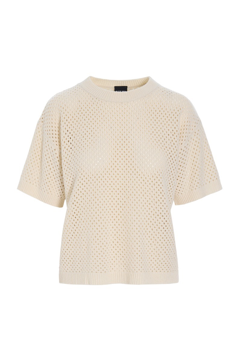 Denna stickade blus med ett delikat spetsmönster kombinerar komfort med elegans. Blusen är underbart mjuk att ha på sig. Spetsmönstret gör blusen genomskinlig, så det är perfekt att ha en topp, T-shirt eller skjorta under.