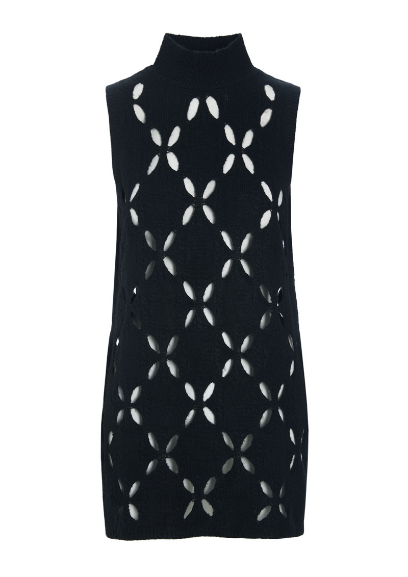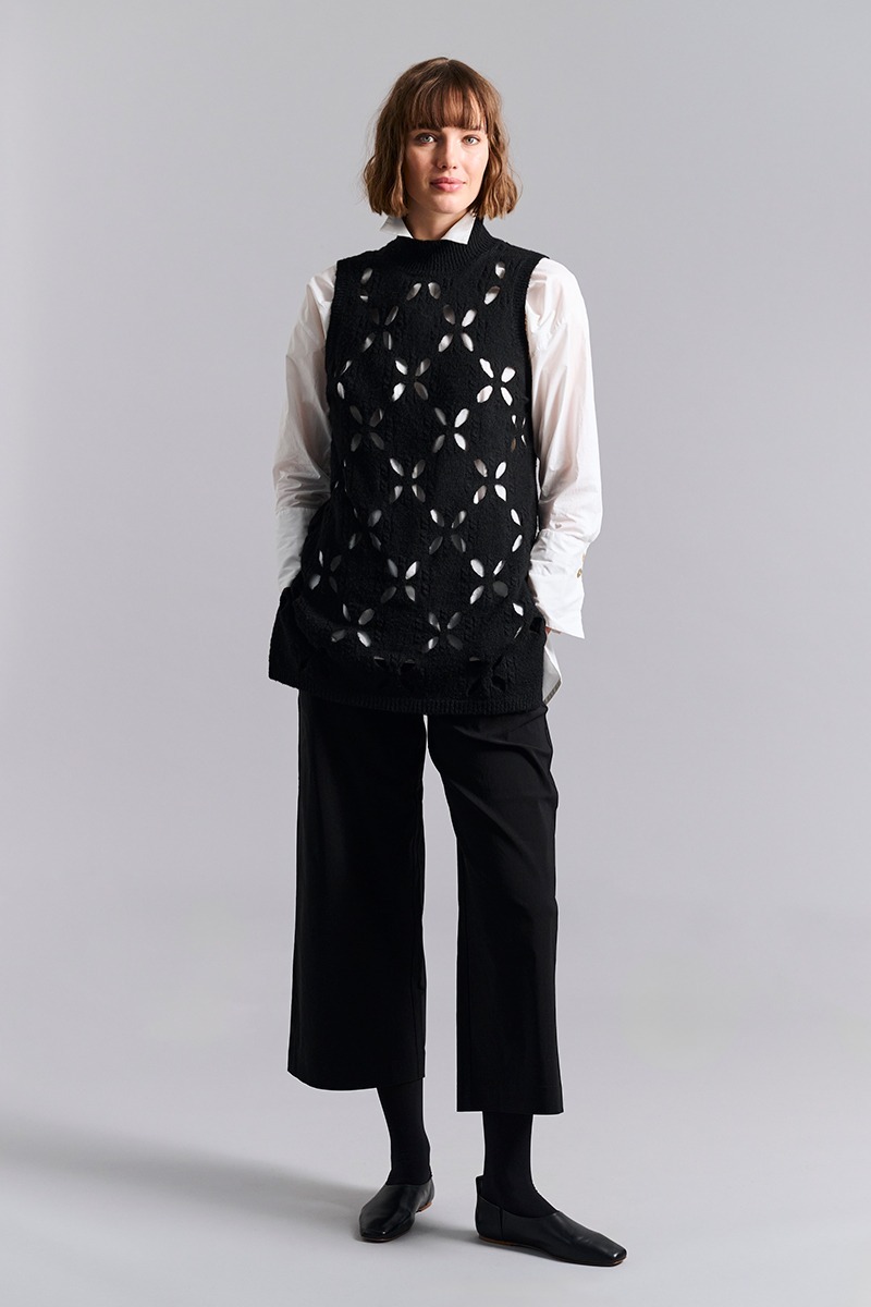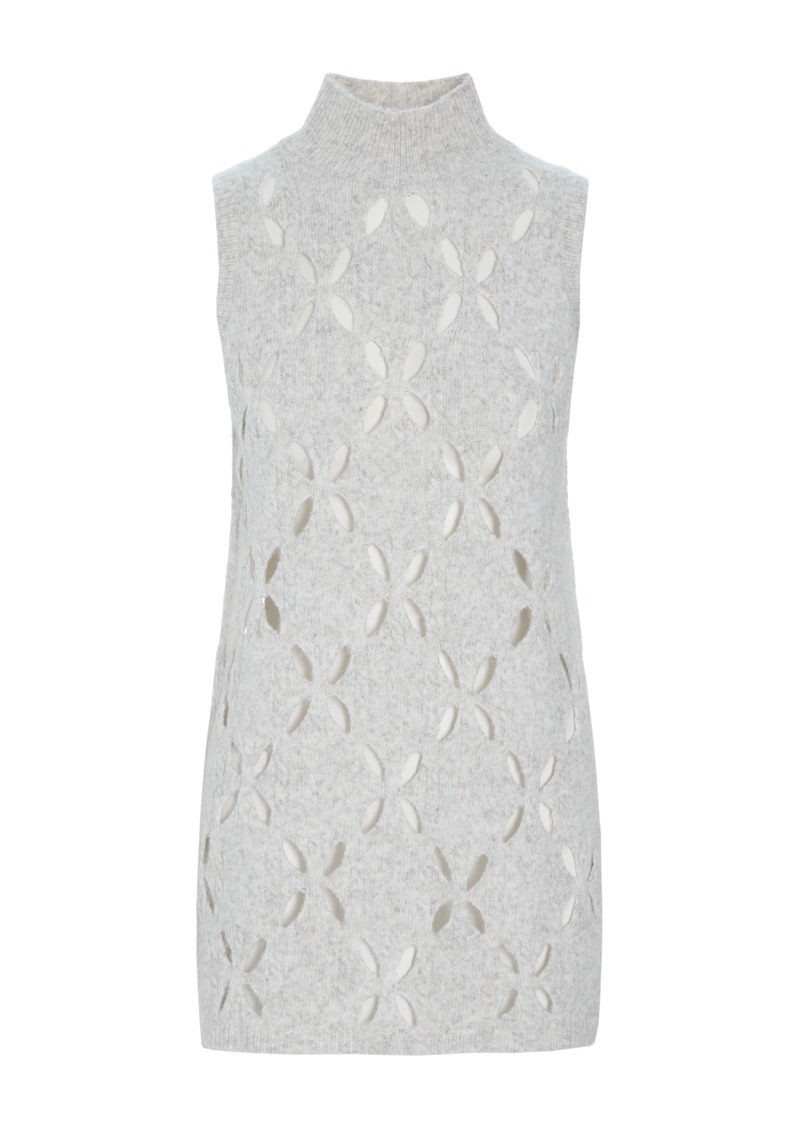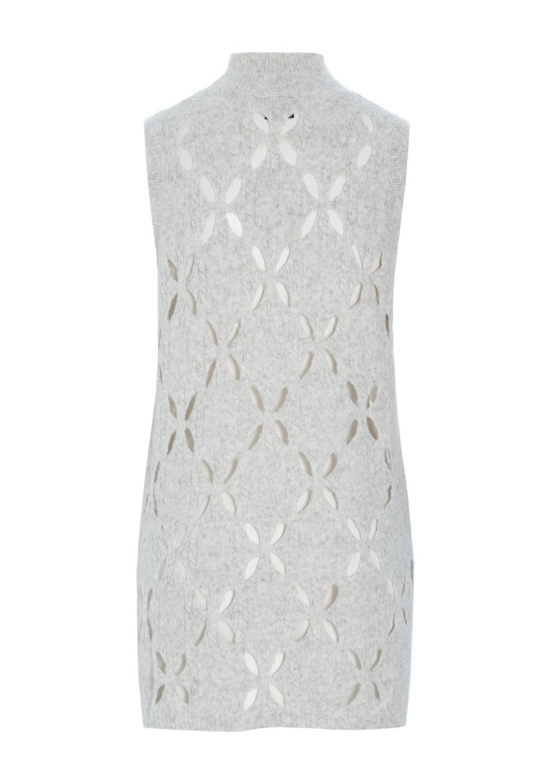 Finstickad, ärmlös blus med ett vackert hålmönster som ger en glimt av lagren under blusen. Mycket feminint och sofistikerat. Blusen har en smickrande längd och en relativt smal passform, vilket skapar en slank silhuett. Använd blusen som en väst över en t-shirt, skjorta eller kroppsnära blus.