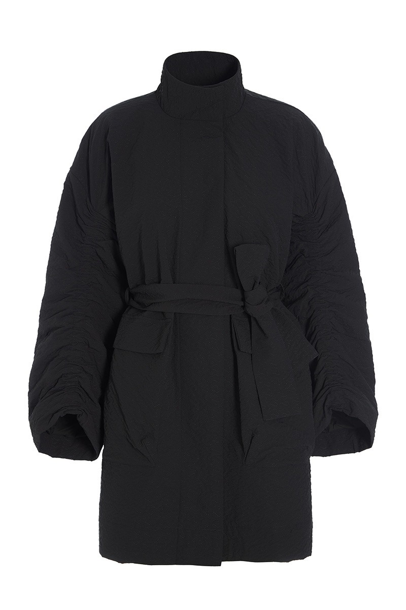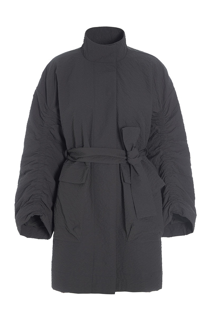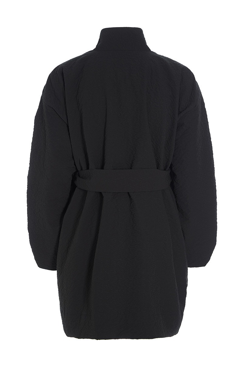 Varm och mysig quiltad jacka med knytbälte i midjan, vilket ger en fin form. Ärmarna drar till sig uppmärksamhet tack vare den rynkade effekten som skapar en draperad look. Mycket elegant jacka som är varm och mjuk på samma gång.