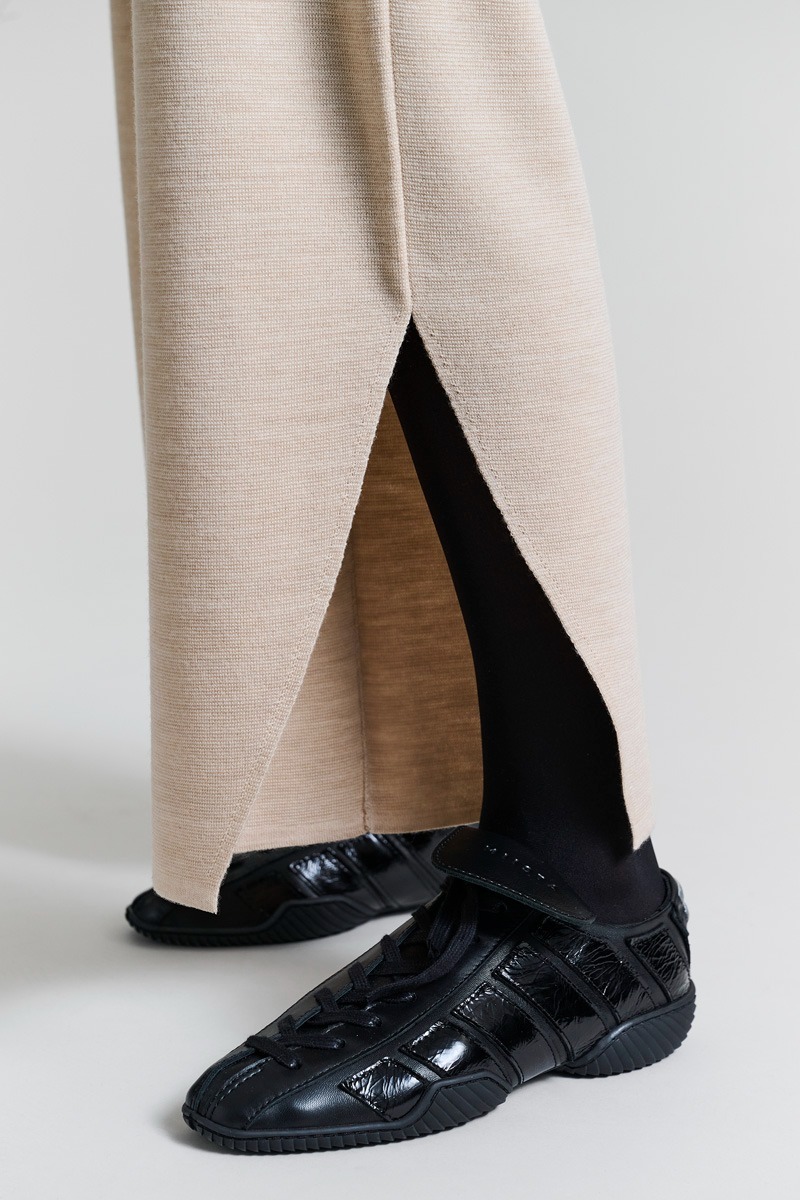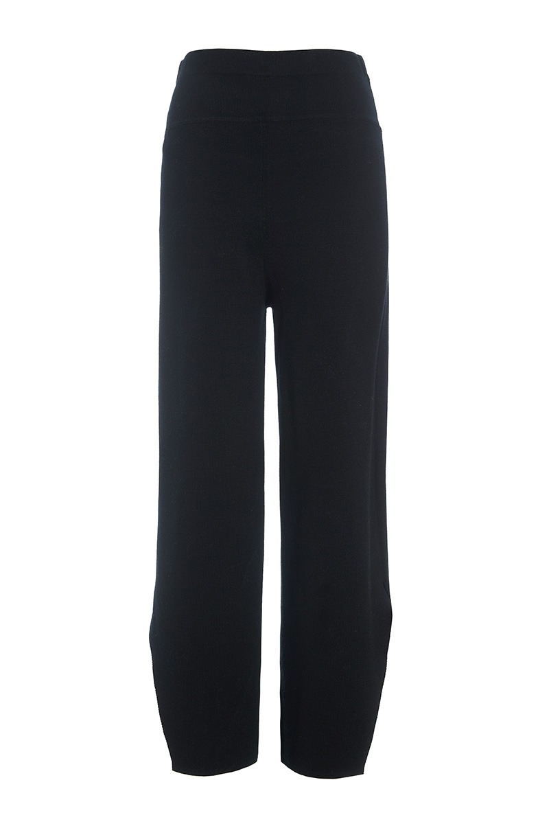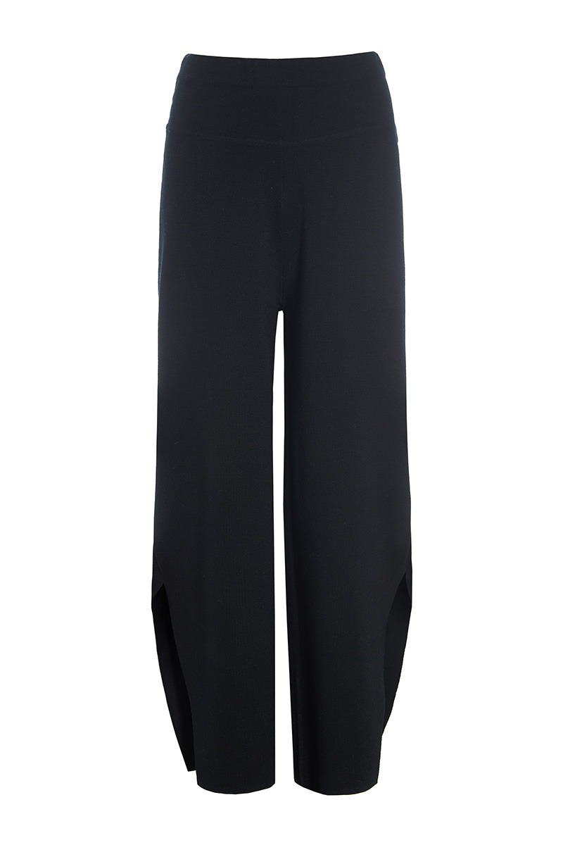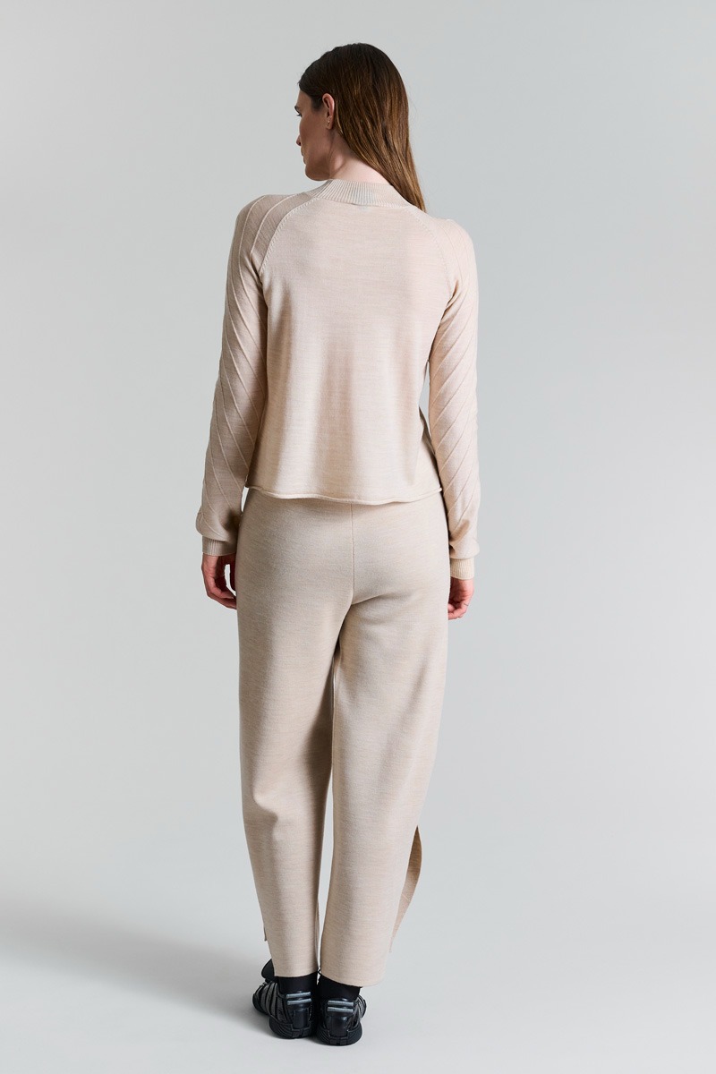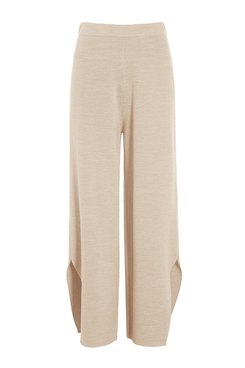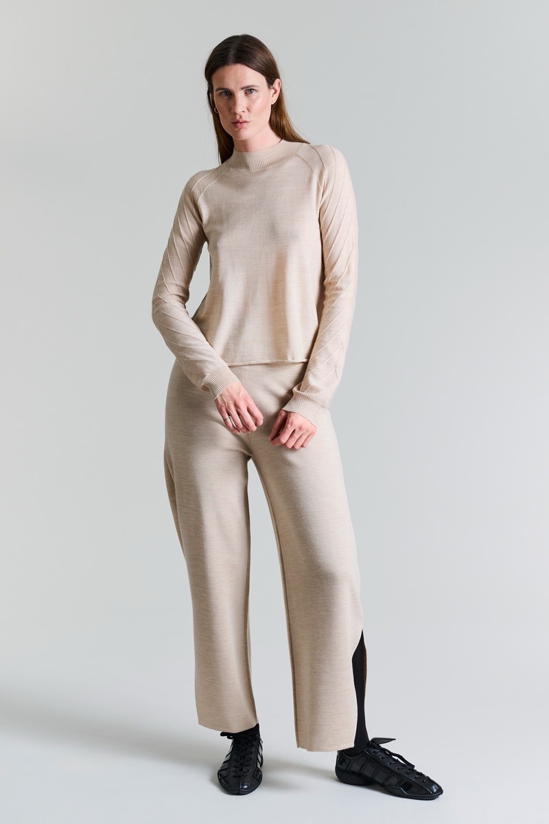 Finstickade byxor i en härlig tät ullkvalitet. Byxorna har slitsar längst ner på benen, vilket ger designen en lätthet. Byxorna är bekväma och lyxiga på samma gång. Bär dem med en vit T-shirt eller en lös skjorta. Tillsammans med den matchande Nisu-tröjan med hög hals får du ett elegant stickat set.