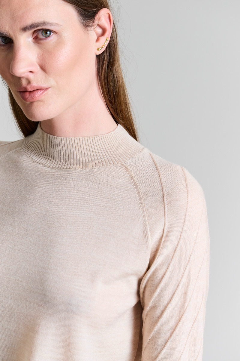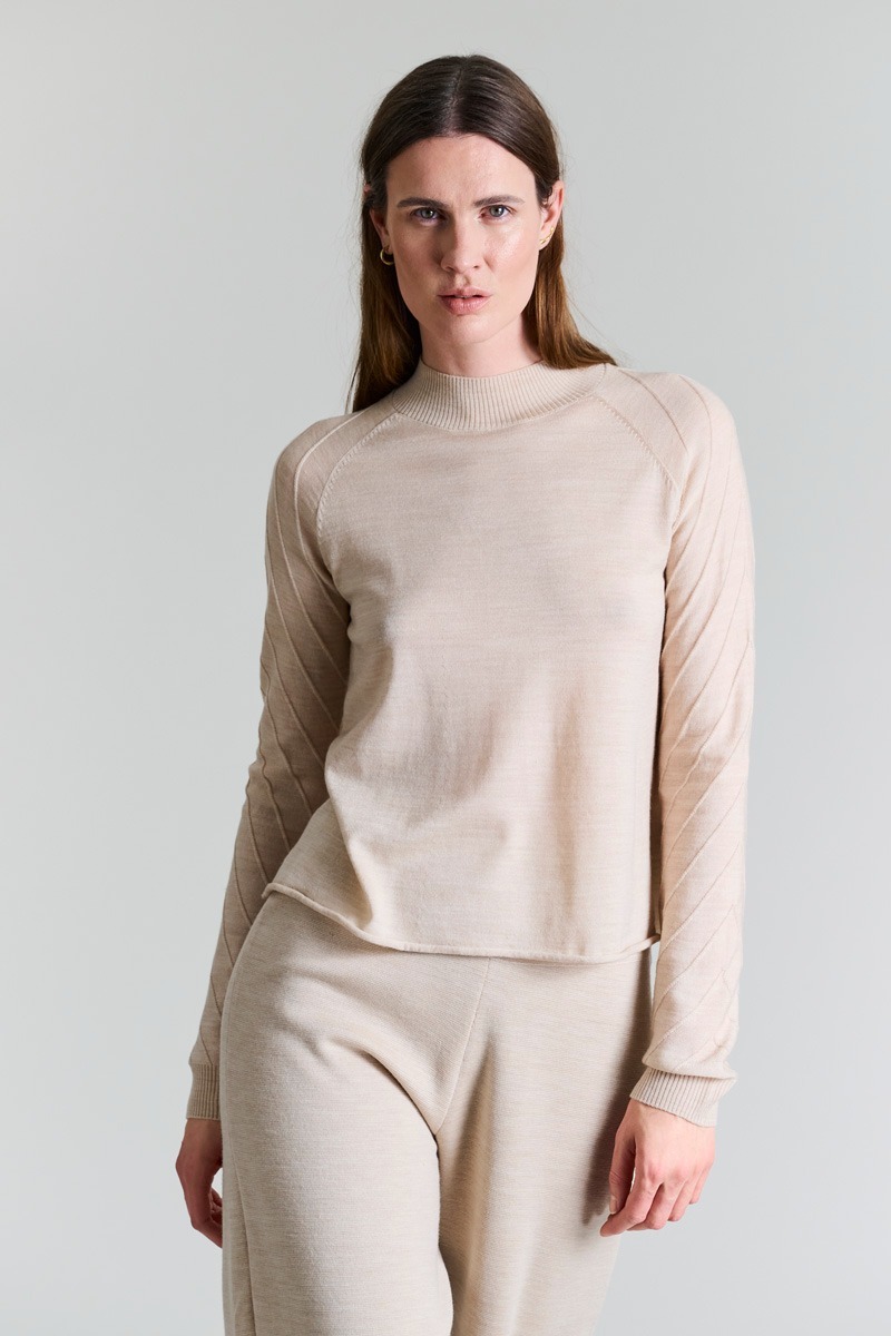 Finstickad tröja i en härlig ullkvalitet och med randigt tryck ner längs ärmarna. En perfekt baströja som kan kombineras med vilken nederdel som helst. Tillsammans med matchande Nisu-byxor får du ett stickat set som är både bekvämt och lyxigt.