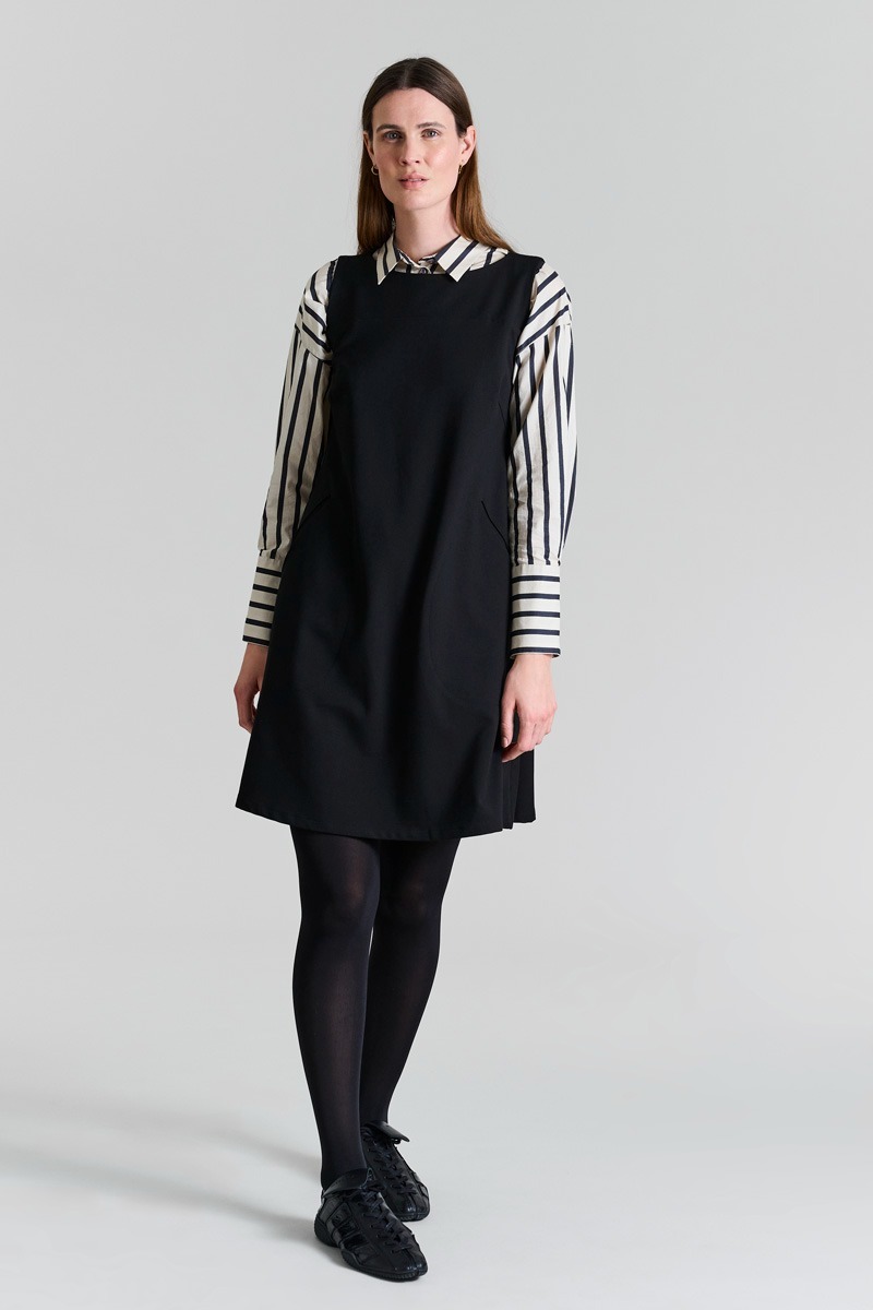 Vacker och enkel klänning med en tidlös och klassisk skärning. Bär klänningen med bara armar. Du kan också bära en skjorta eller en åtsittande polotröja under. Om du kombinerar klänningen med den matchande Noru-jackan får du en snygg och komplett look.