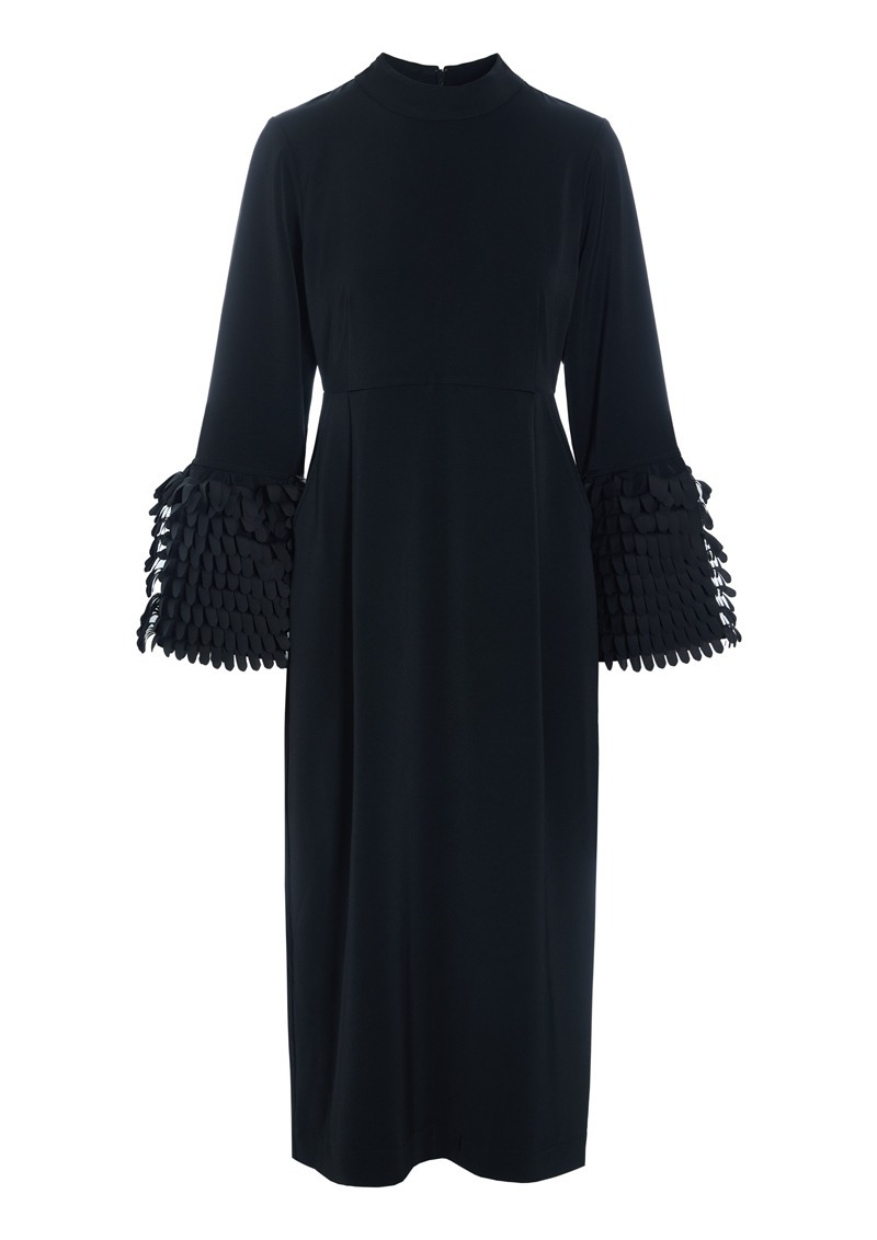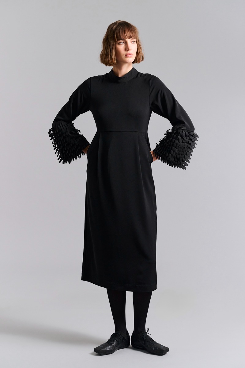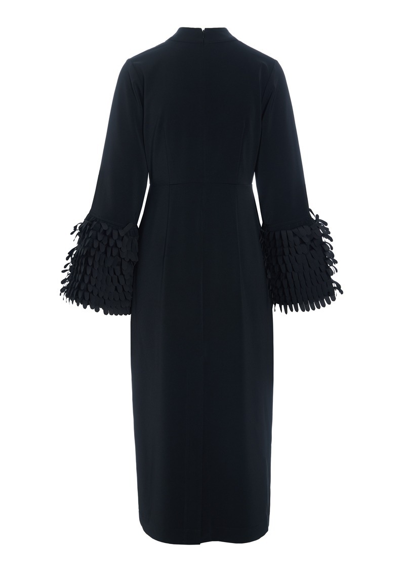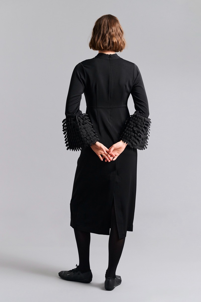 Denna klänning har en enkel och elegant skärning, som får en raffinerad twist med de speciella volangerna på ärmarna. De lätta, flerskiktade volangerna rör sig vackert vid varje steg och ger klänningen ett feminint och lekfullt uttryck. Det finns stretch i tyget, vilket gör klänningen både bekväm att ha på sig och lätt att röra sig i – perfekt för både vardag och fest.
