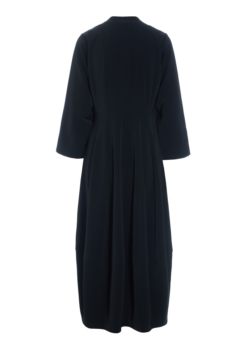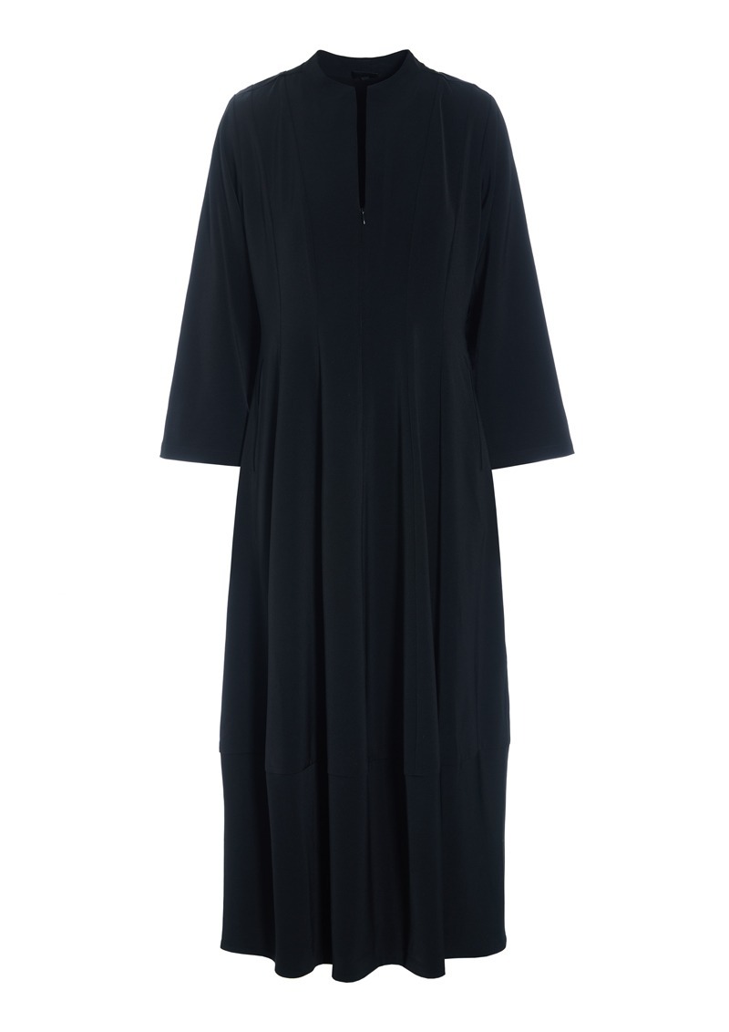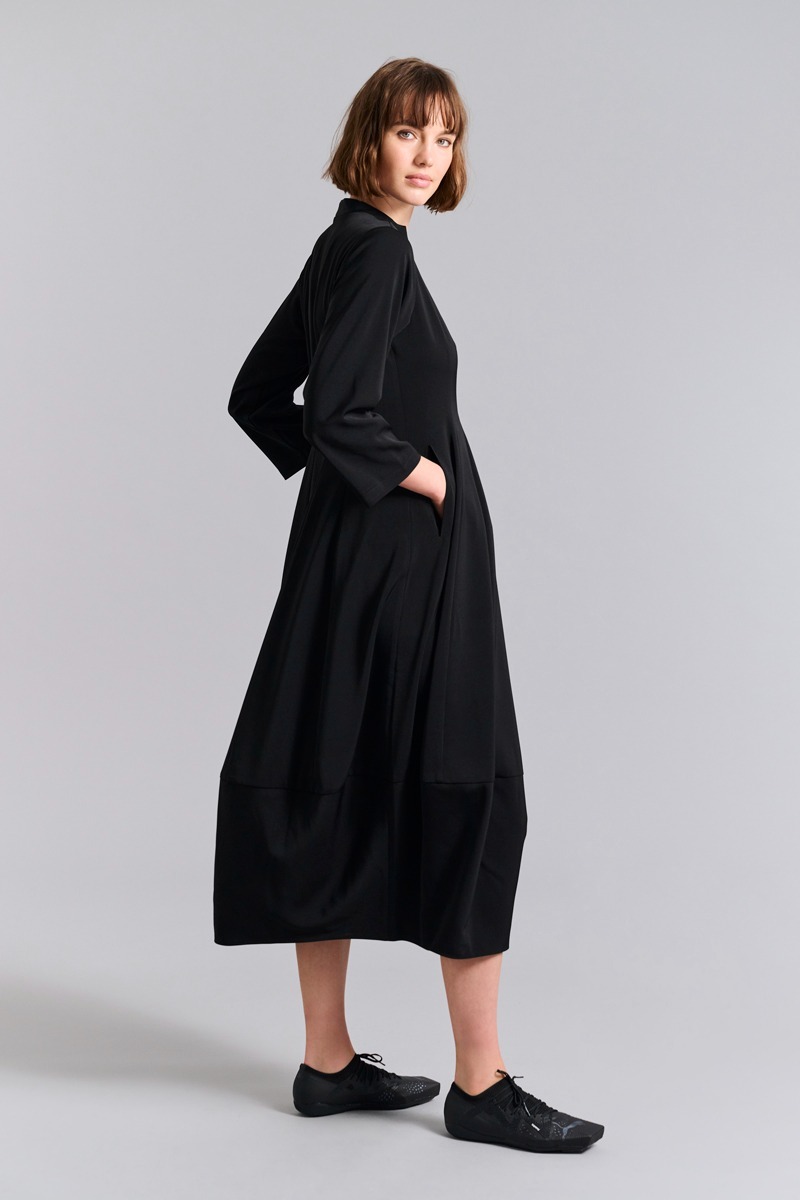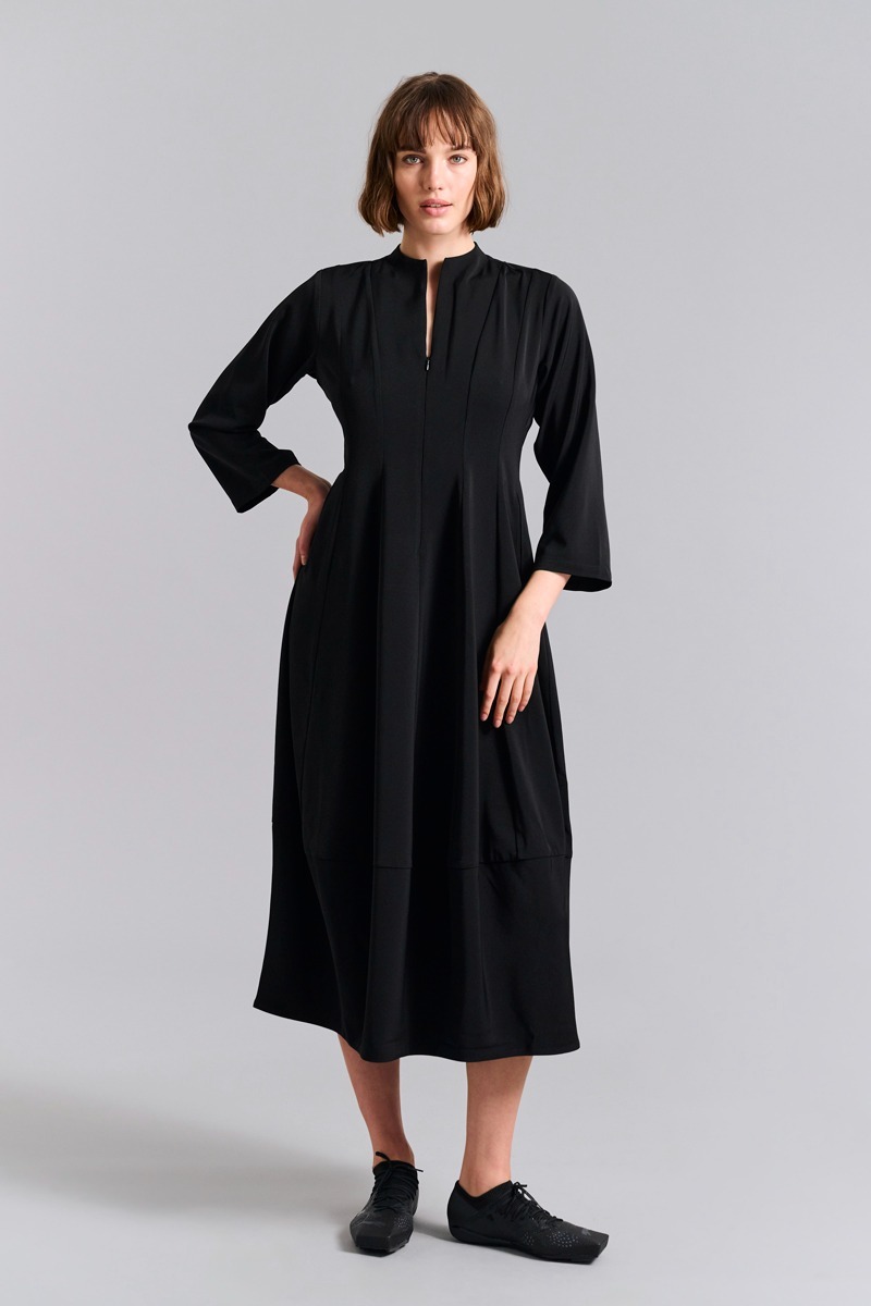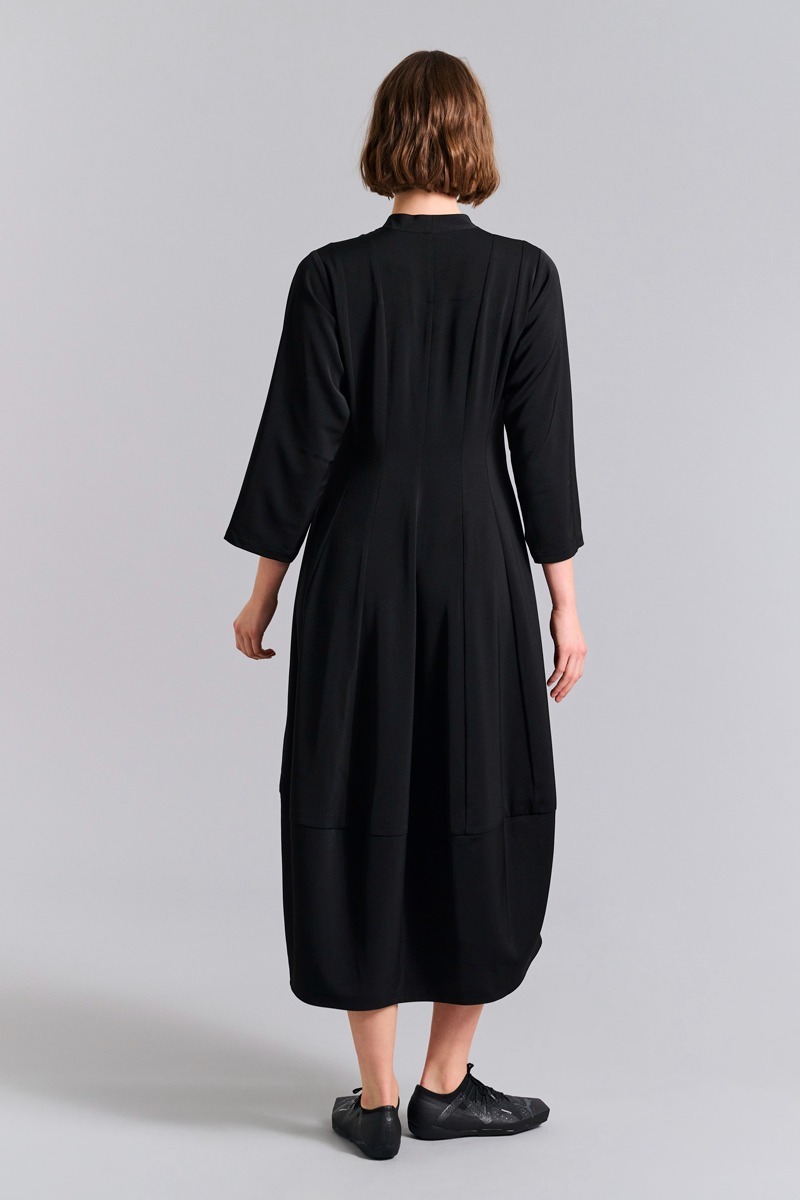 Denna klänning har en enkel och nästan skulptural skärning med den lilla kragen, den lätta midjeringen och den tulpanformade kjolen. Det finns stretch i tyget, så klänningen är mycket bekväm att ha på sig. En stilren klassiker som kan användas både på jobbet och vid festliga tillfällen.