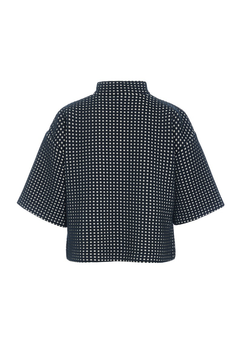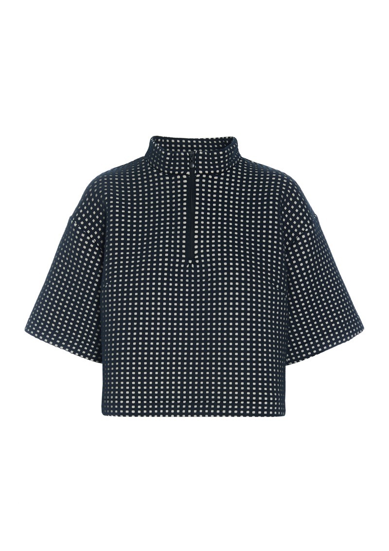 Helt enkel kortärmad blus med fina, små rutor och dragkedja. Blusen är i ett kraftigt tyg med stretch, vilket säkerställer god rörlighet. Det är självklart att använda blusen för en lager-på-lager-look med en kroppsnära blus under.
