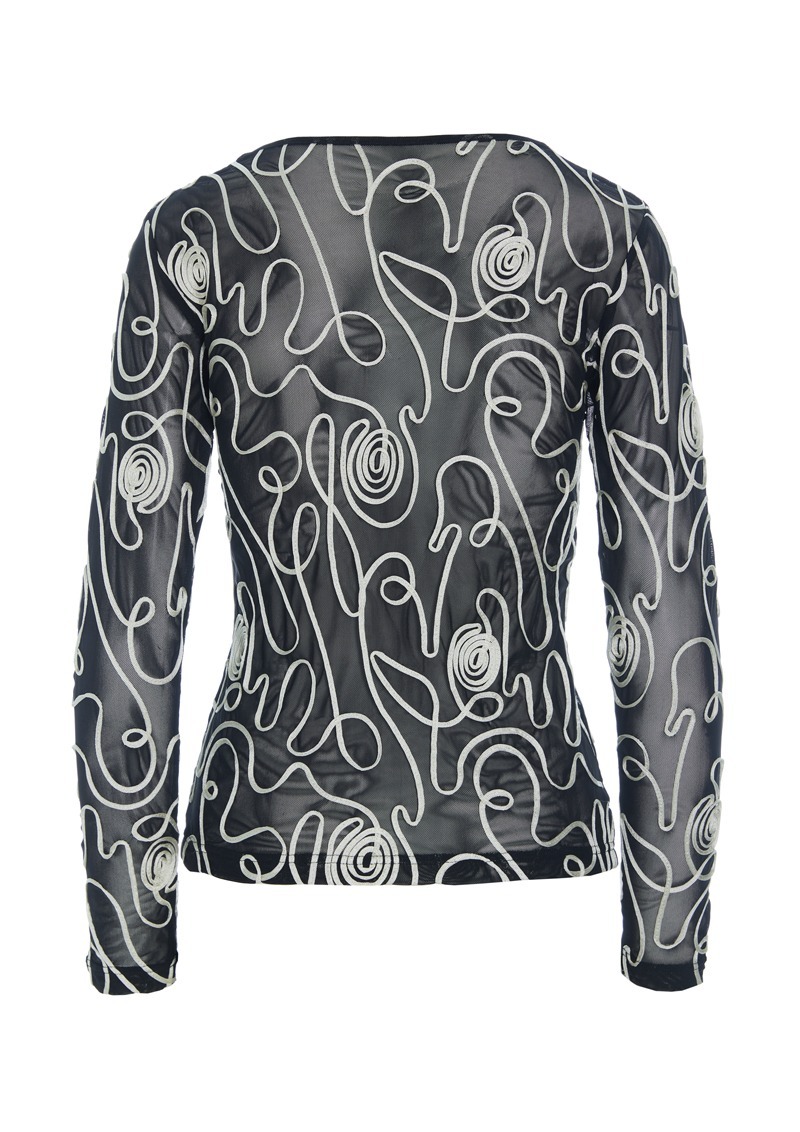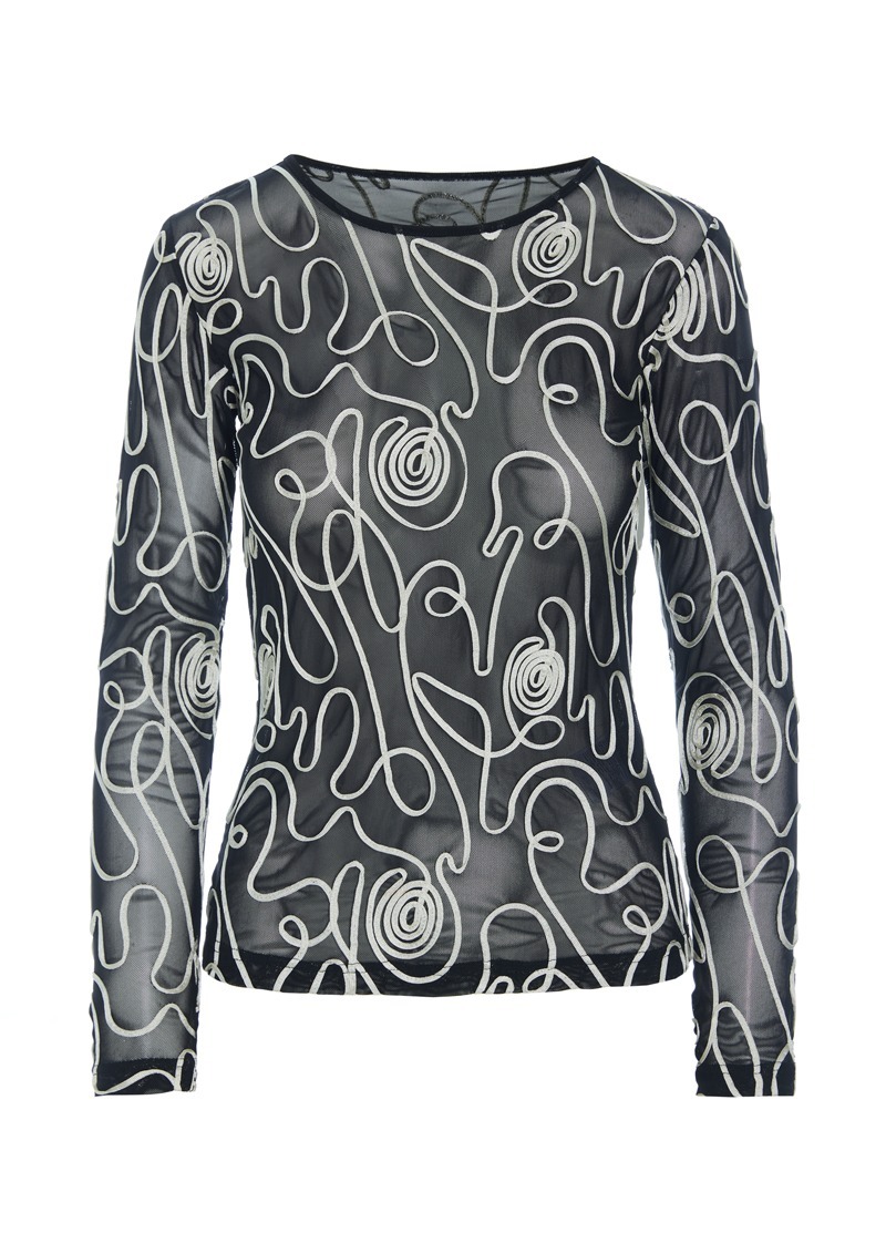 Otroligt vacker, åtsittande t-shirt i transparent mesh med ett broderat mönster som omsluter kroppen. Det är ett självklart val att använda t-shirten för en lager-på-lager-look, där den kikar fram under lagren.