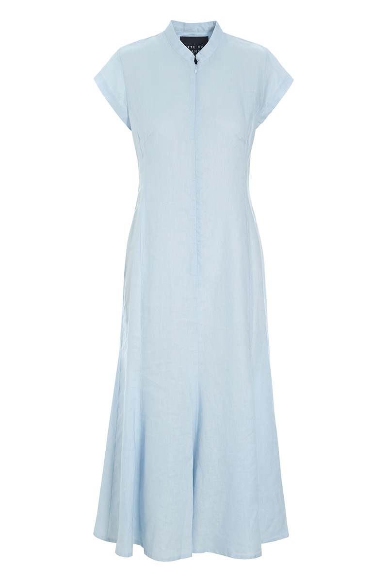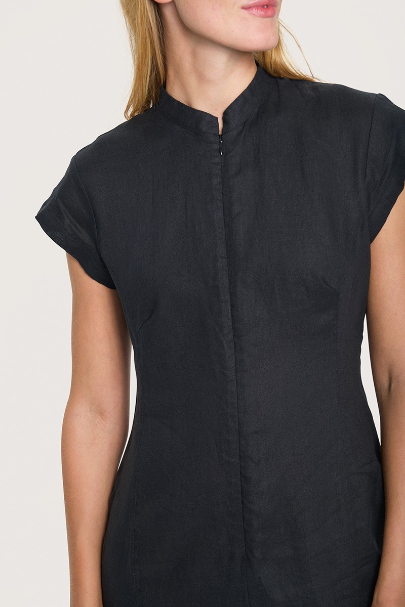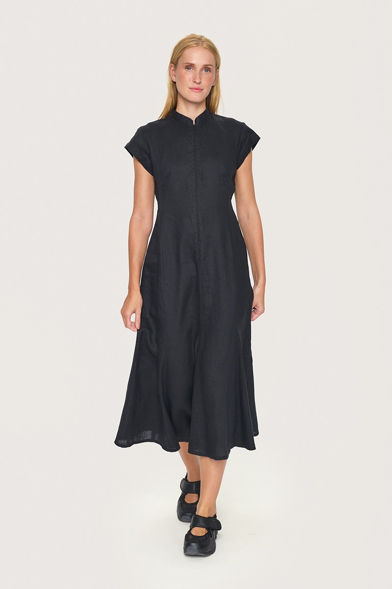 A long, simple dress made of high-quality linen that drapes beautifully, thanks to the mermaid silhouette. The mandarin collar fits elegantly around the neck. A beautiful and flattering dress that works for both everyday wear and special occasions – just adjust the accessories.