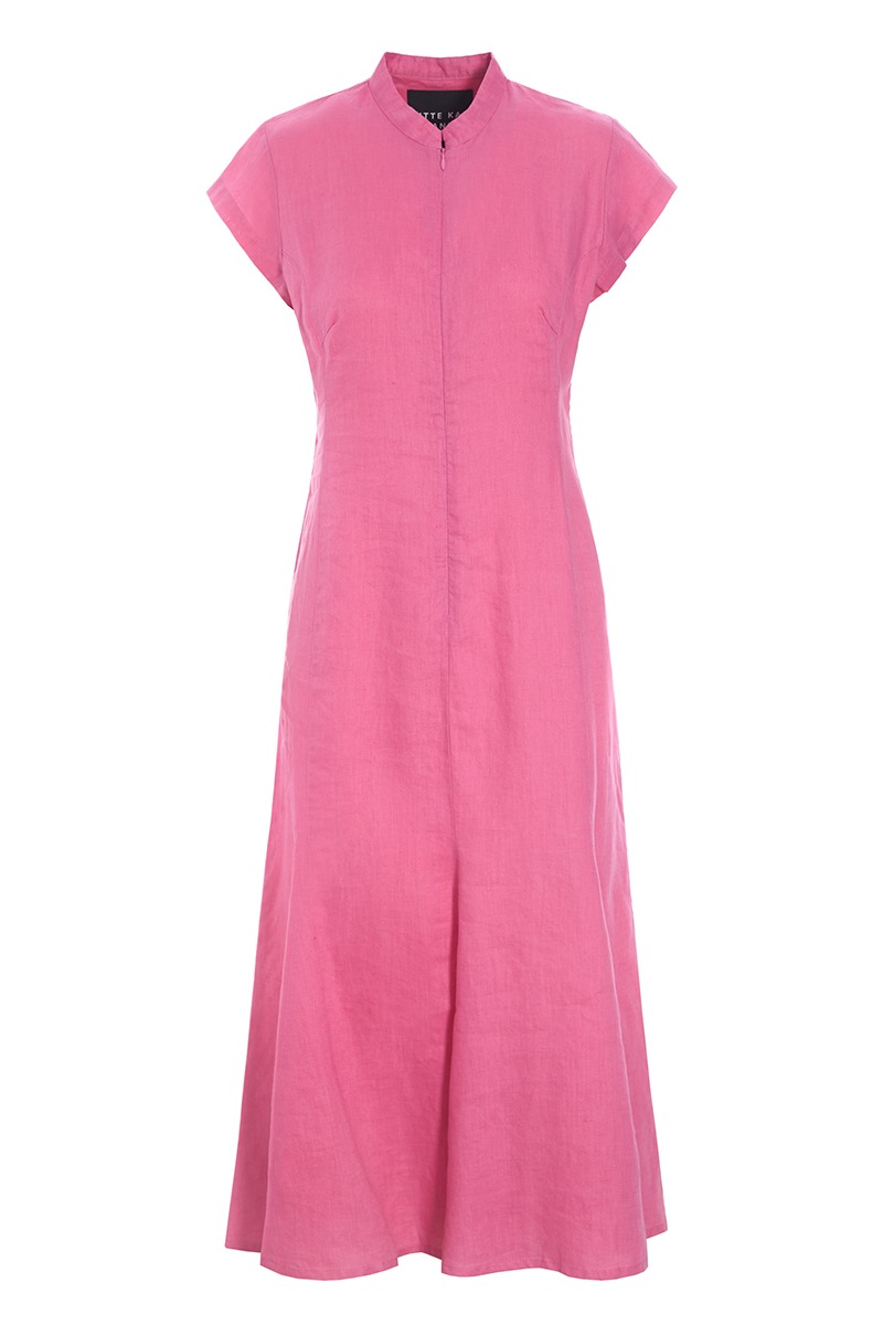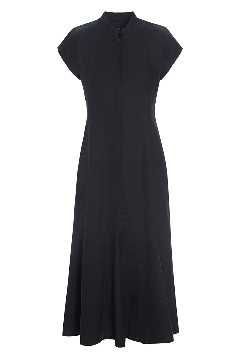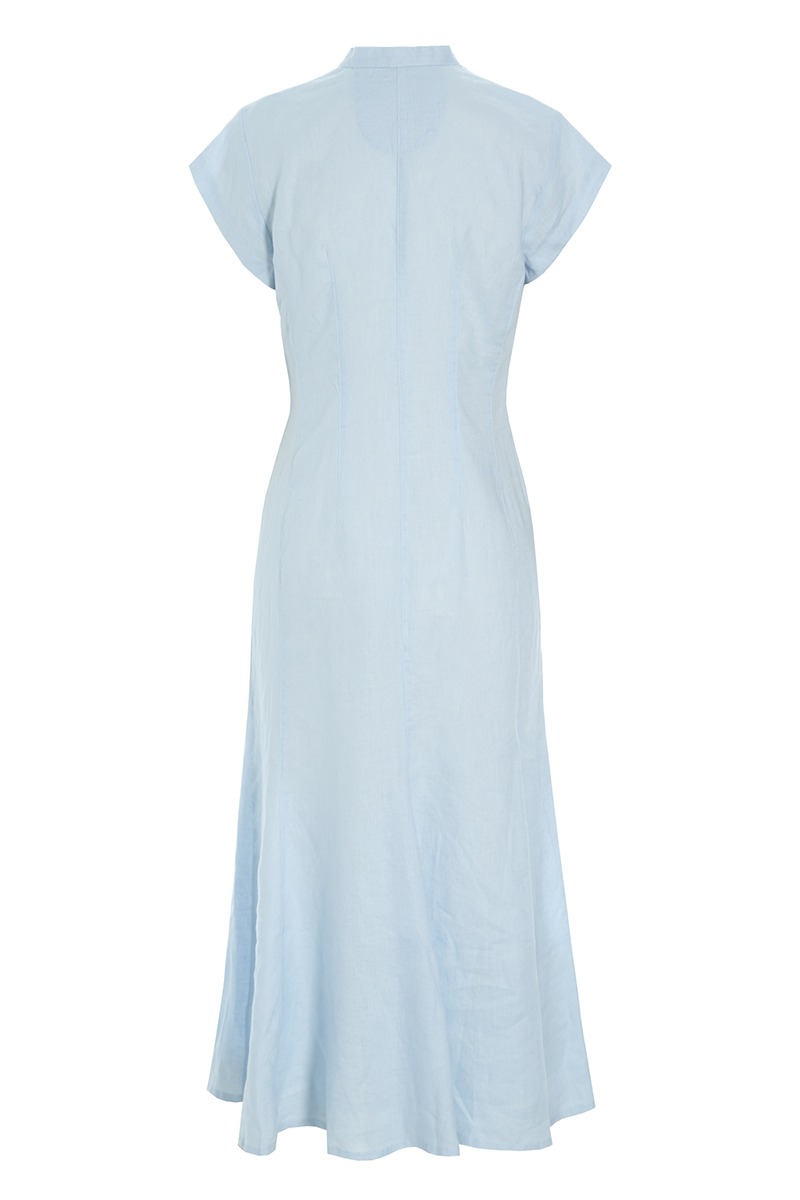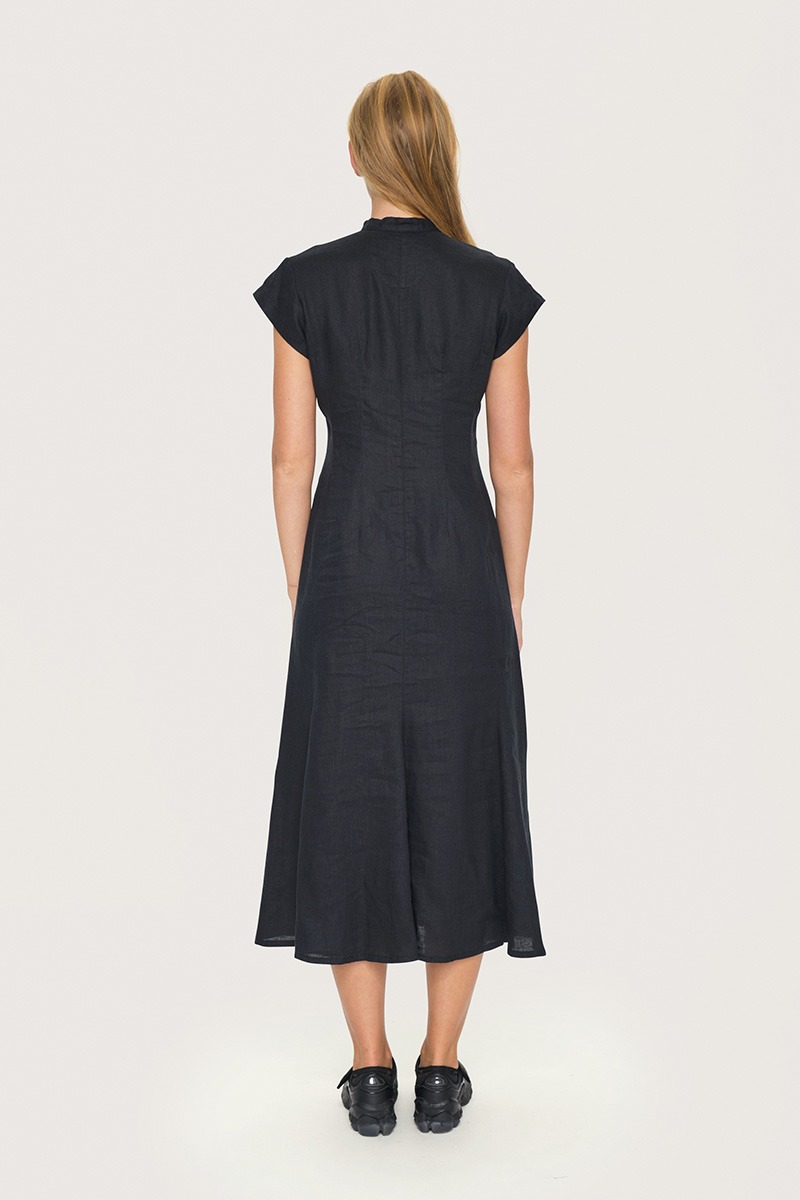 A long, simple dress made of high-quality linen that drapes beautifully, thanks to the mermaid silhouette. The mandarin collar fits elegantly around the neck. A beautiful and flattering dress that works for both everyday wear and special occasions – just adjust the accessories.