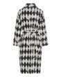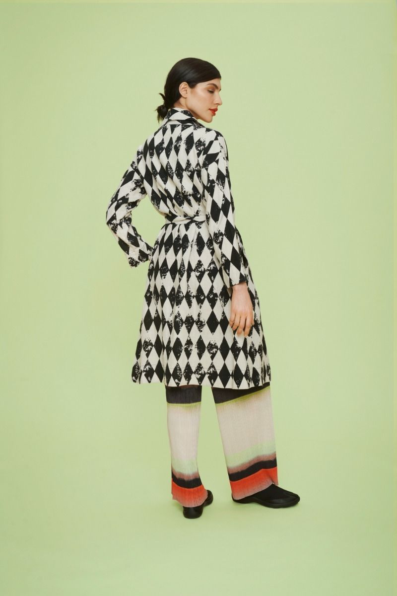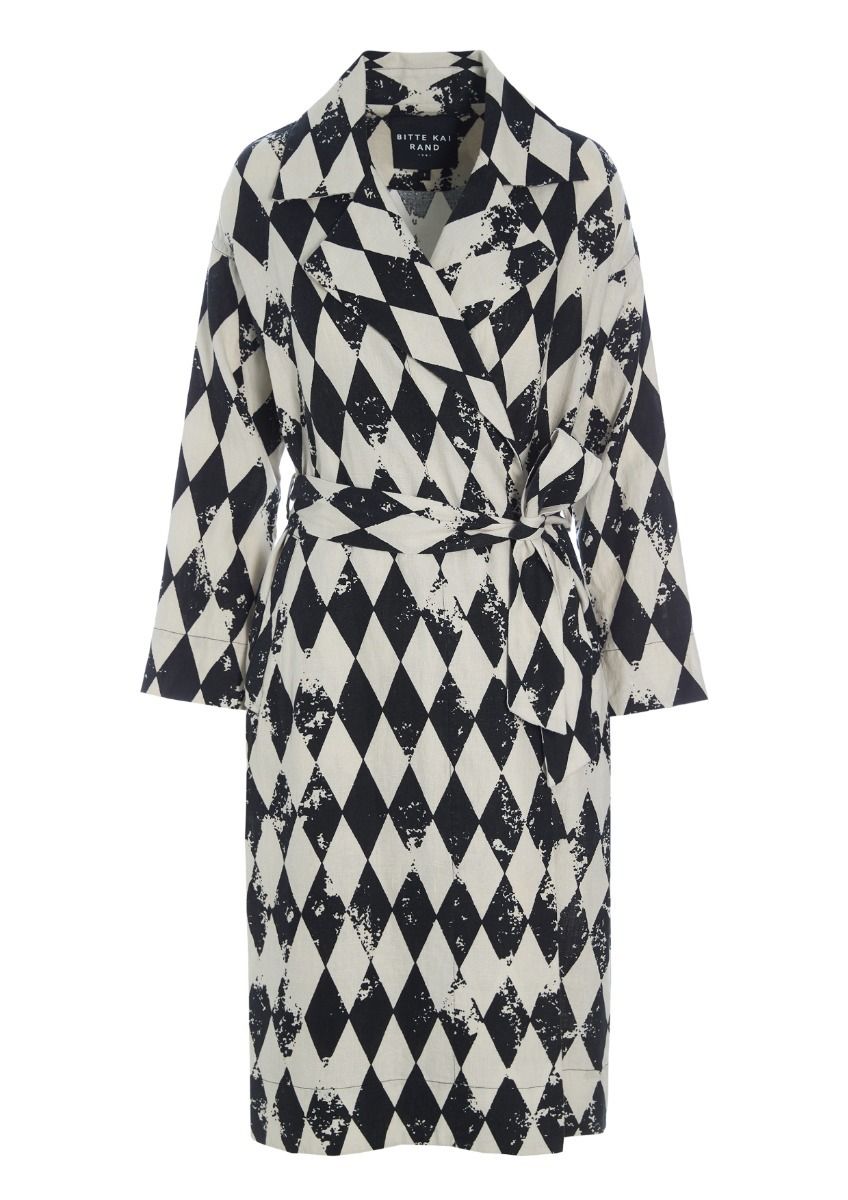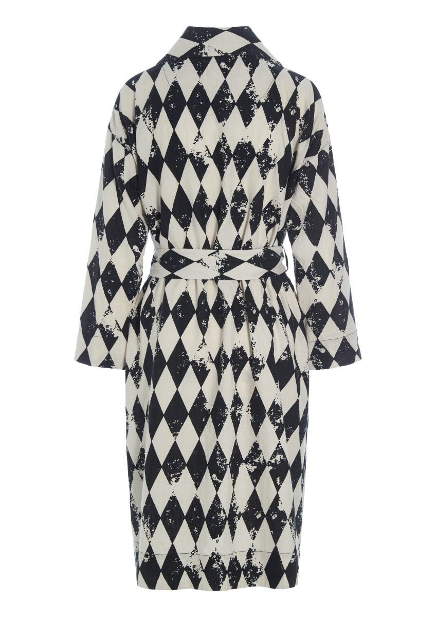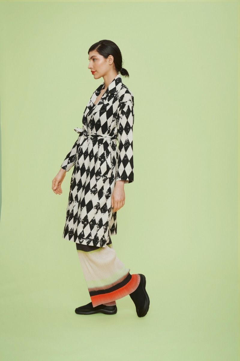 Very flattering and eye-catching jacket with a striking Harlequin print. The jacket's belt emphasises the waist and gives a great silhouette. Use it to add character to a basic solid colour set. Or pair it with other prints for a personalised pattern mix.