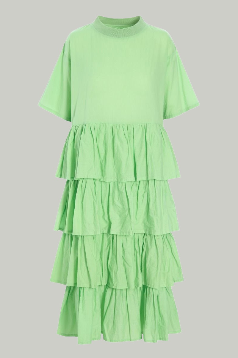Make an ordinary day a party—or make a party a little more fun—with this gorgeous dress featuring wide ruffles for tons of volume and a beautiful drape. All that's left is to add a stunning pair of shoes.