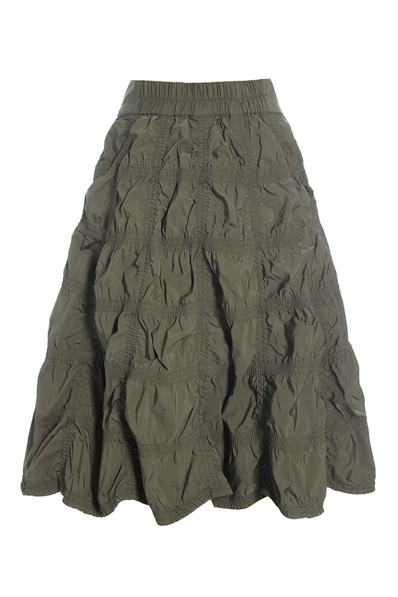 The elastic bands on this skirt run both vertically and horizontally to create a chequered effect that gives the skirt a puffy, voluminous look. The wide waistband beautifully accentuates the waist. It's a stunning, eye-catching skirt that works equally well for everyday wear and festive occasions. The model in the photo is 180 cm tall and wearing a size S Length from the waist in a size S: approx. 70 cm.