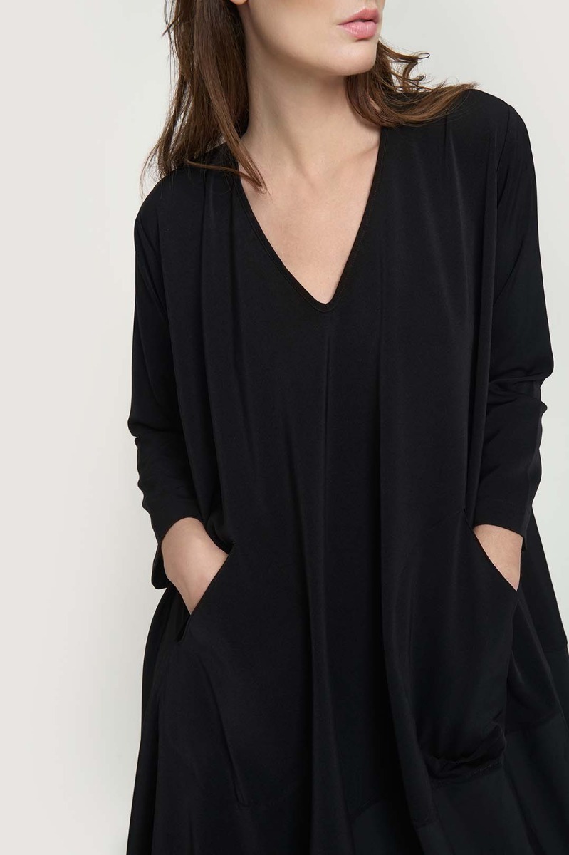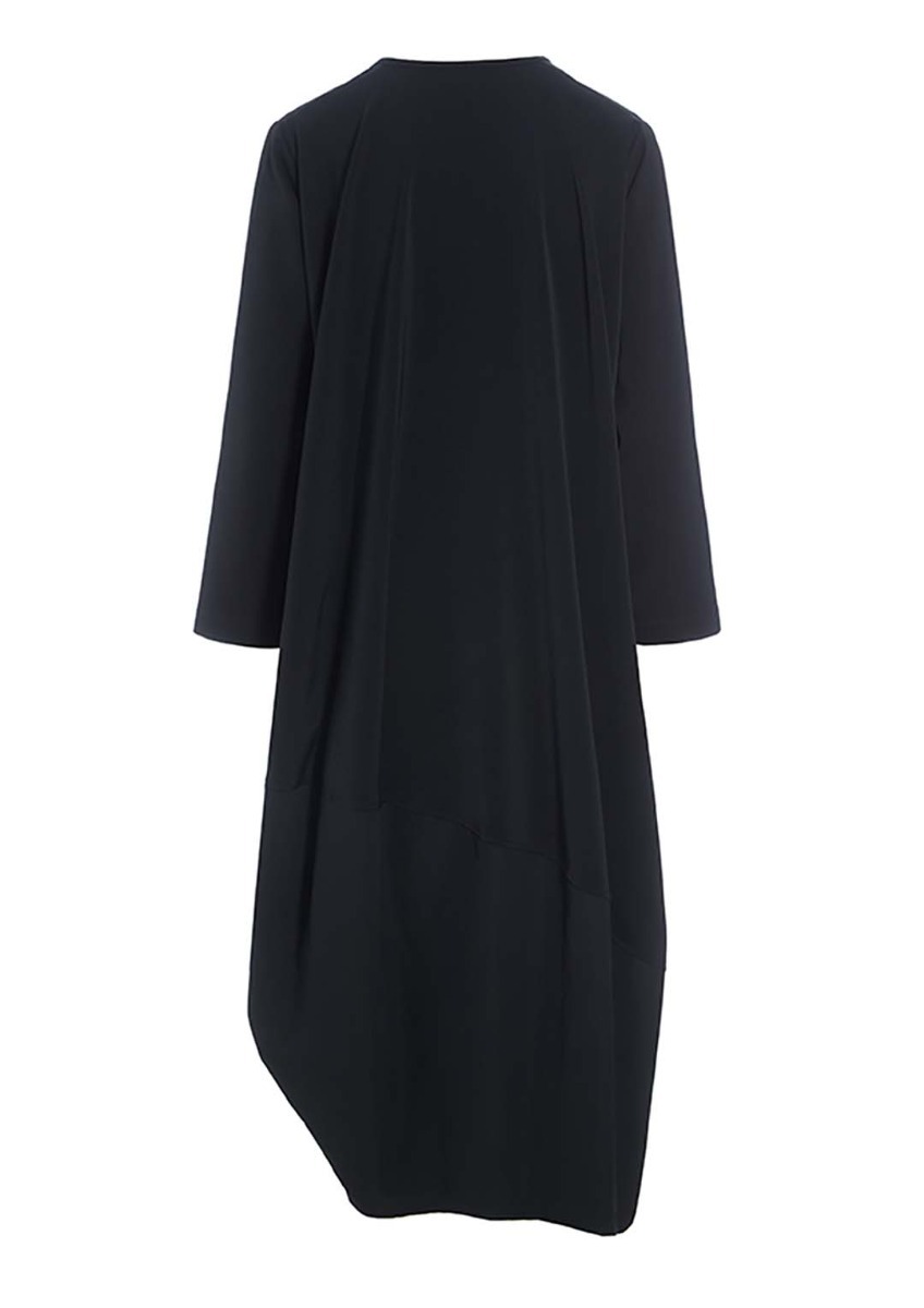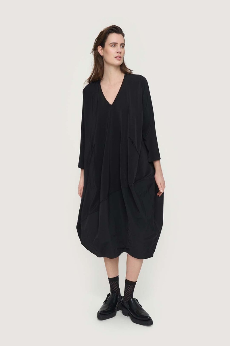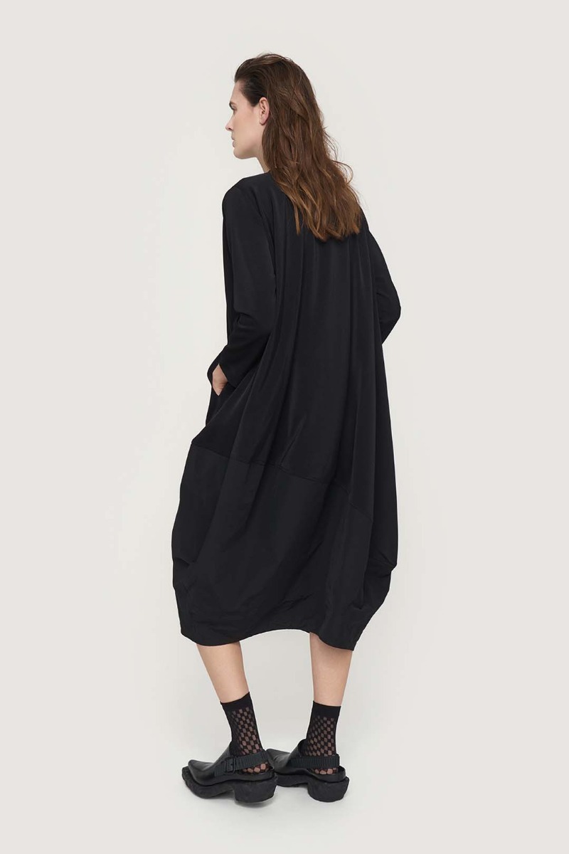 This oversized dress has a unique, asymmetric cut on the skirt and tapers slightly at the bottom, giving the soft fabric a beautiful drape. The asymmetric shape creates an almost sculptural look. The bottom of the dress is combined witha piece of taffeta that creates a play between the two black qualities. This dress is happy to speak for itself—just add shoes and stockings to suit your mood.