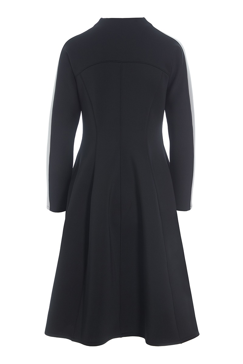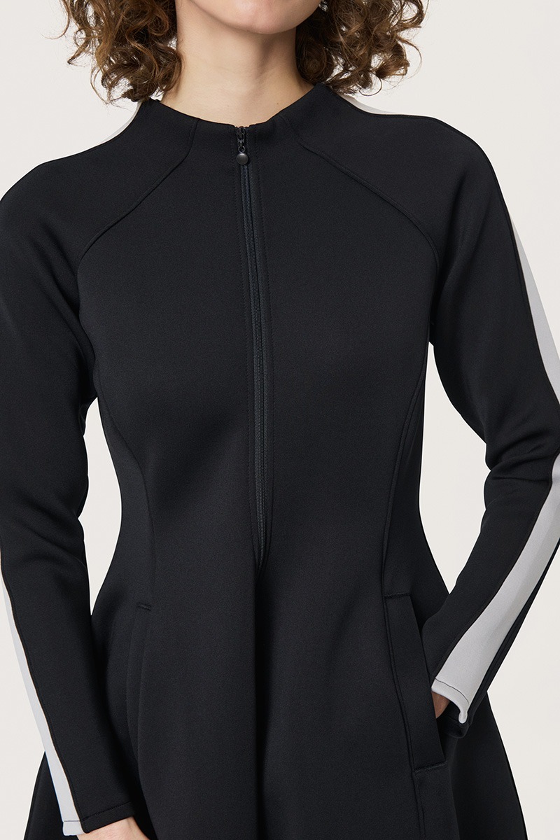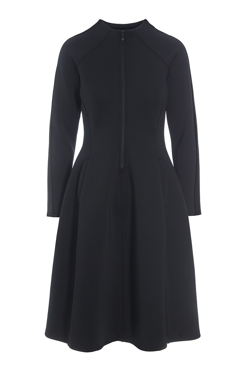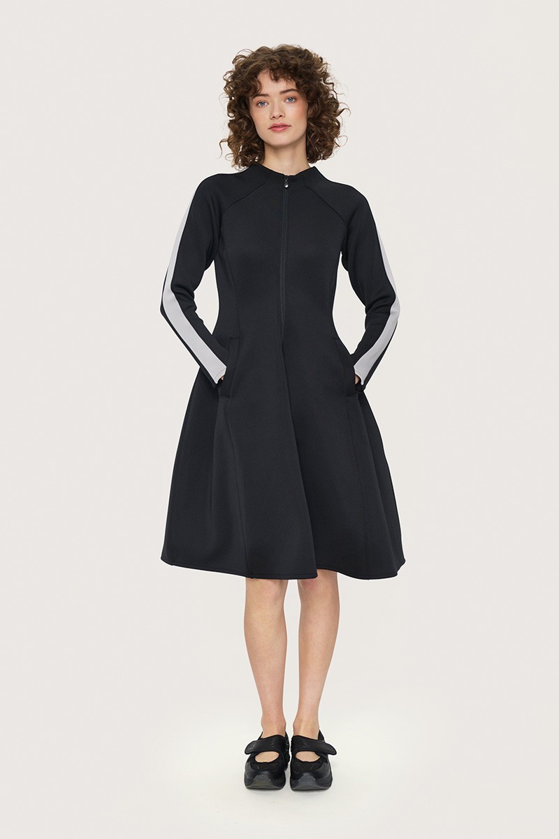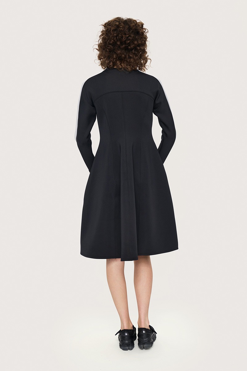 A sporty yet feminine dress made of neoprene. It creates a beautiful fitted silhouette, and the durable fabric drapes beautifully around the body. The neckline fits snugly, while the zipper closure adds a cool touch. A perfect everyday dress that can also be styled for evening wear.