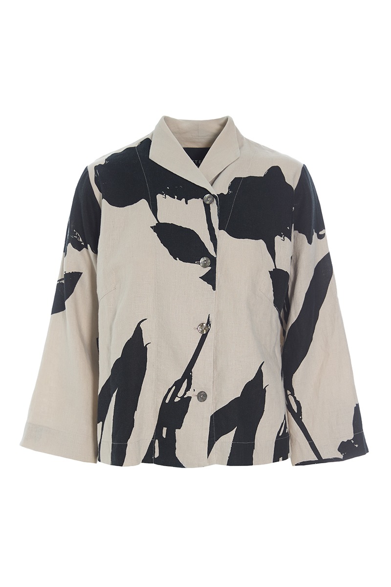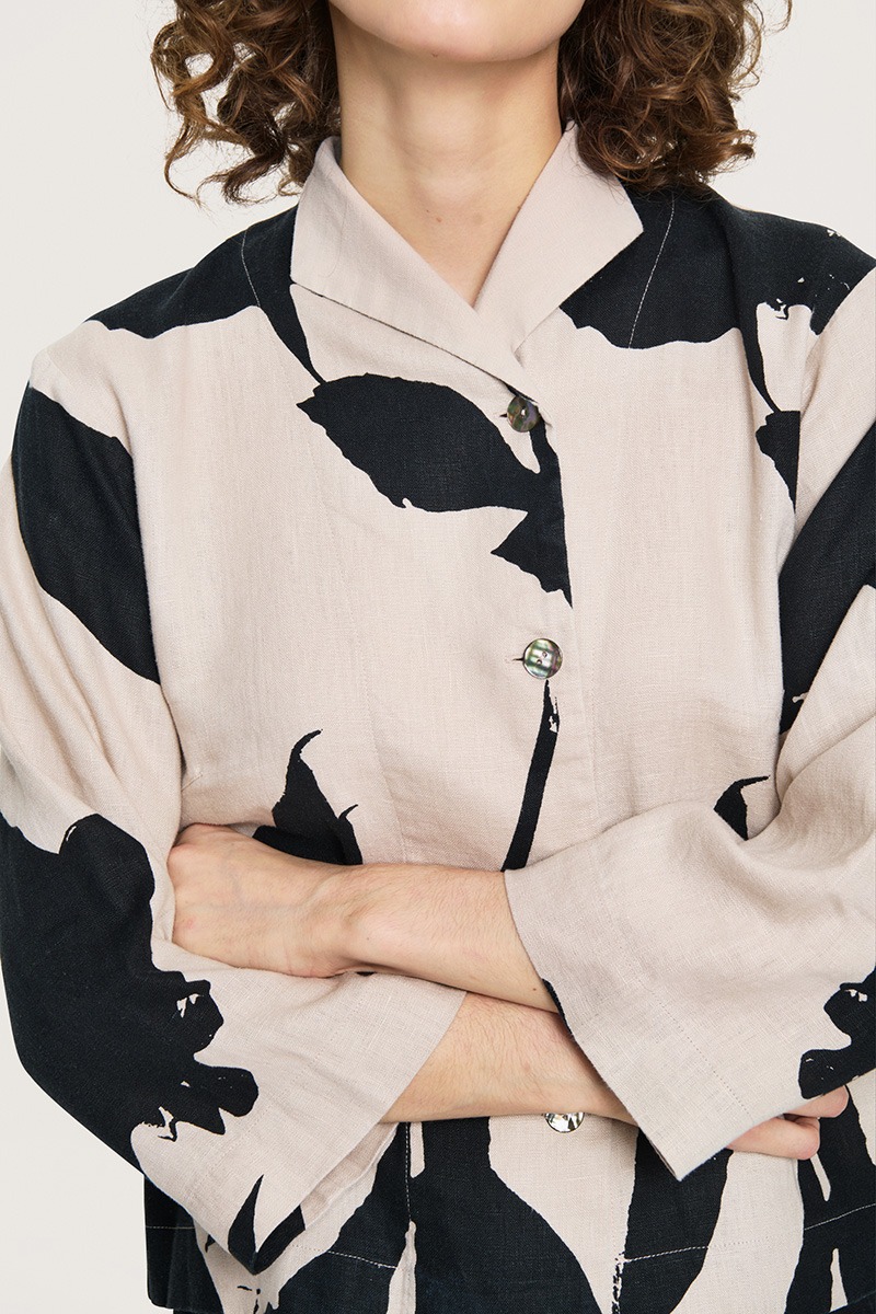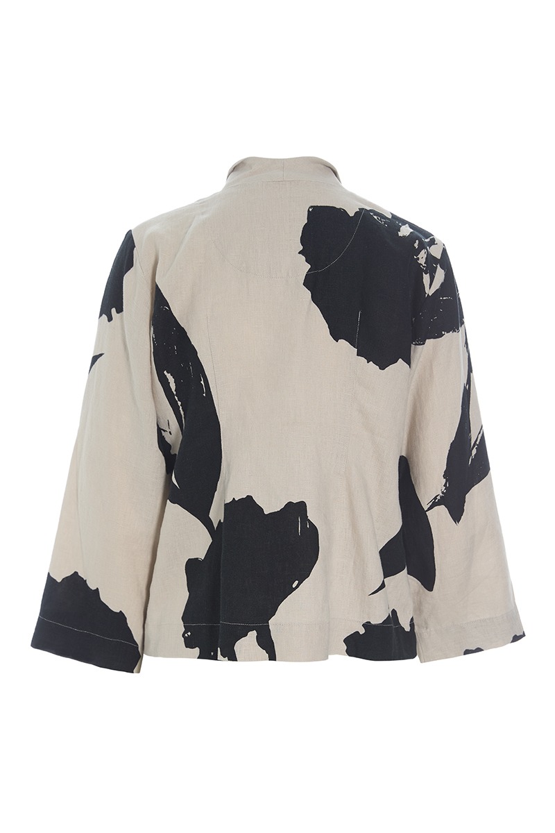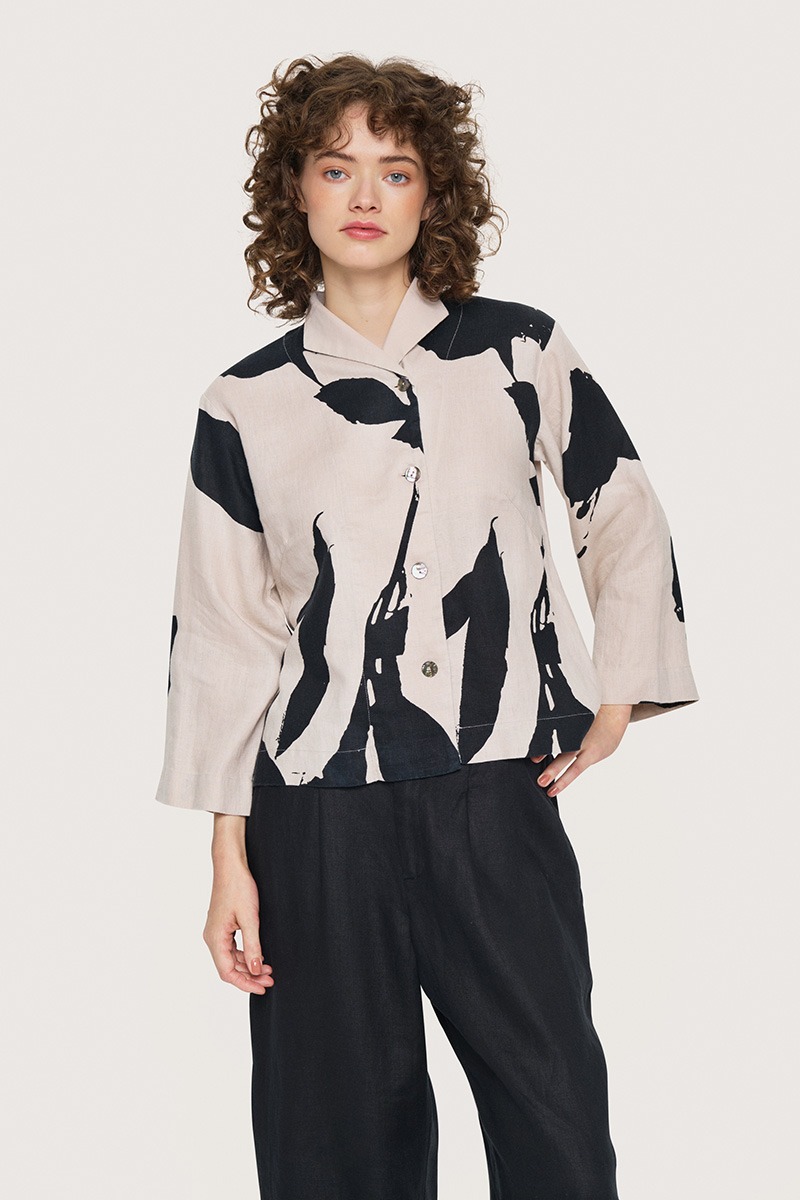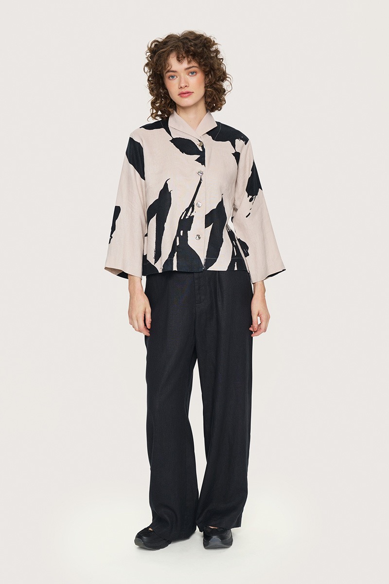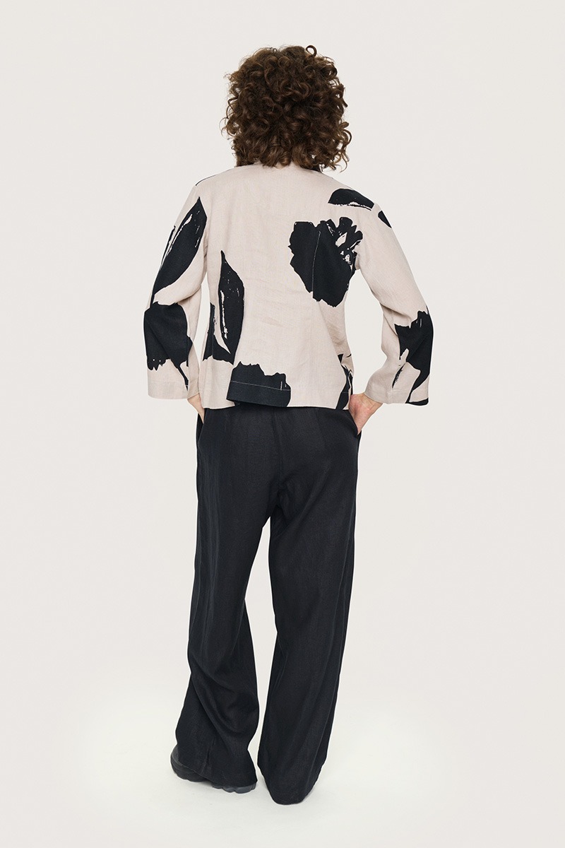 A short jacket with a beautiful black-and-white floral print. The jacket can be paired with almost anything. Style it with a long skirt, jeans, or as part of a set with the matching Shadow Blossom trousers. The jacket’s soft linen quality makes it extremely comfortable to wear.